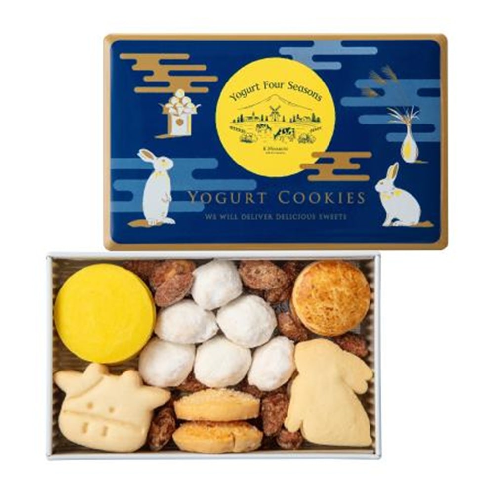 季節限定で、お月見の装いをしたクッキー缶をご用意しました。黄色い満月を眺めるうさぎとお月見団子に見立てたクッキーを、お月見デザインの専用缶に詰め合わせました。