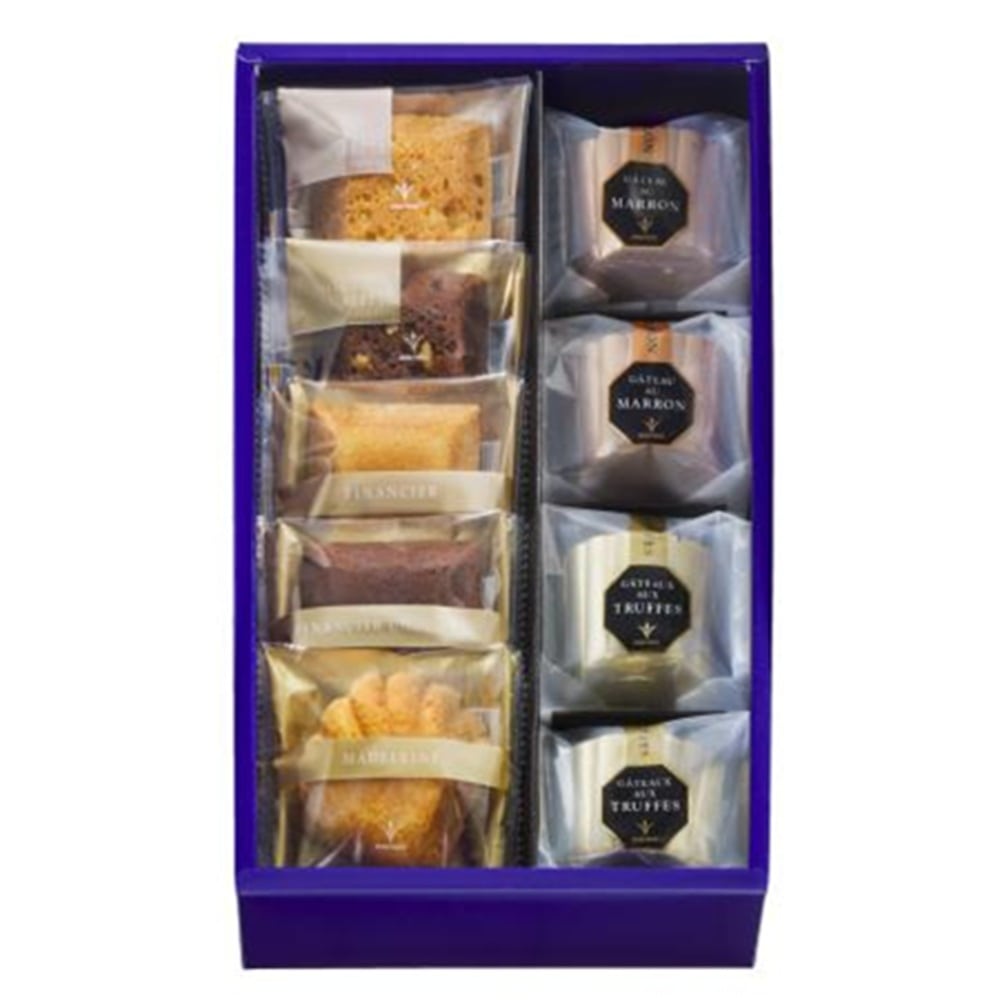 世界食品コンテスト「2022年モンドセレクション」において金賞受賞の「トリュフケーキ」「ガトー・オ・マロン」をはじめ、マドレーヌ、フィナンシェ、ヌーヴェルガレットとブールミッシュの定番焼菓子を詰め合わせたギフトセットです。