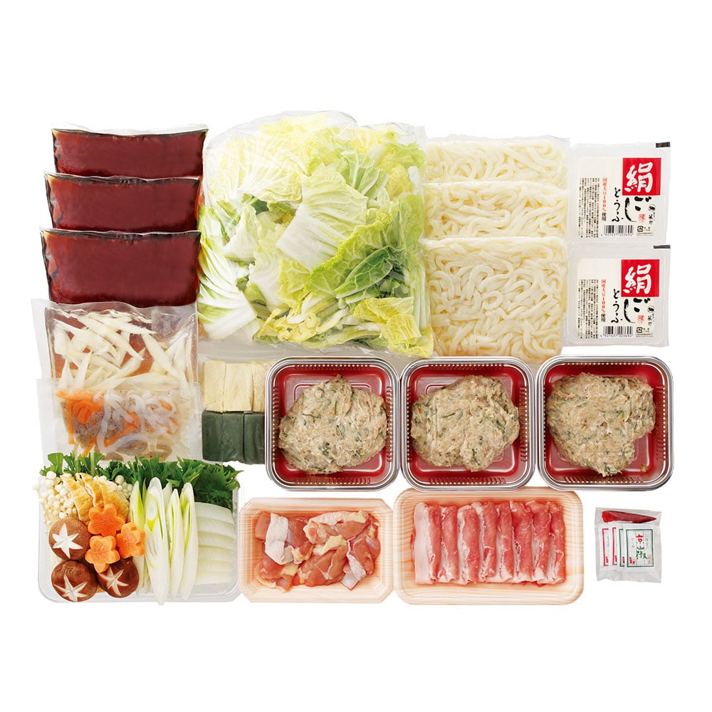 肉団子450g、豚肉・鶏肉各100g、白菜、椎茸、えのき、水菜、聖護院大根、京人参、葱、ささがきごぼう、豆腐、揚げ、蒟蒻、京生麩、京湯葉、うどん3玉、出汁1.5L、七味、山椒