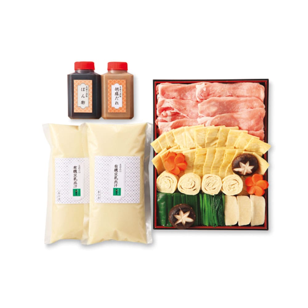 伊勢美稲豚400g、引き上げ湯葉、手繰り湯葉、粟麩、九条葱、壬生菜、椎茸、梅人参、豆乳だし450ml×2、ごまだれ、ポン酢