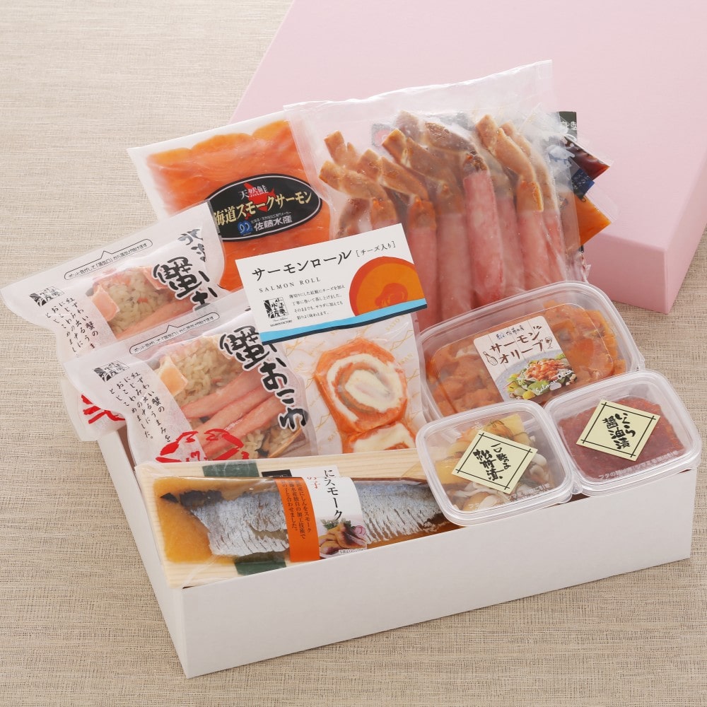 生ずわい蟹棒ポーション300g、ずわい蟹おこわ120g×2、いくら醤油漬60g、一口数の子松前60g、北海道スモークサーモン80g、サーモンロールチーズ入2枚、サーモンオリーブ100g、鰊親子スモーク数の子入1枚、栞セット(だし用昆布5g、ポン酢風味ダレ30g×4、辛口マヨネーズ風味ダレ30g×2)