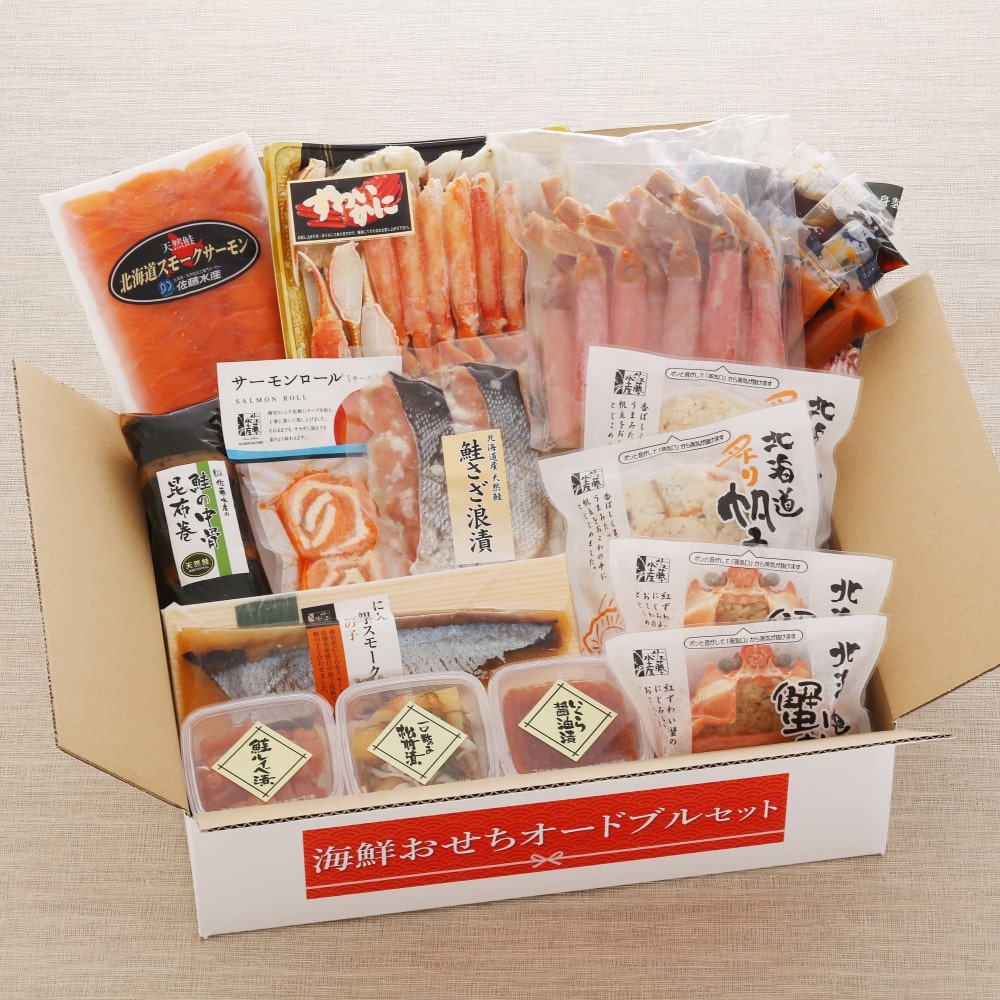 生ずわい蟹棒ポーション300g、ボイルずわい蟹脚320g、ずわい蟹おこわ120g×2、炙り帆立おこわ130g×2、鮭ルイベ漬60g、一口数の子松前60g、いくら醤油漬60g、中骨昆布巻1本、鰊親子スモーク数の子入1枚、サーモンロールチーズ入2枚、秋鮭さざ浪漬200g(2切真空)、北海道スモークサーモン80g、栞セット(だし用昆布5g、ポン酢風味ダレ30g×4、辛口マヨネーズ風味ダレ30g×2)