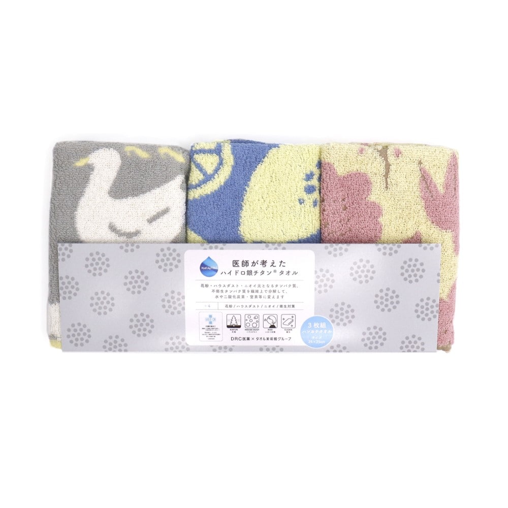 ハイドロ銀チタン(R)タオルは、花粉、ハウスダストなどのタンパク質を分解して水や二酸化炭素に変えてくれます。普段使いにぴったりのタオルハンカチで、年齢問わず幅広くお使いいただけます。3枚セットなので洗い替えにも便利で、その日の気分や服装に合わせて柄を選べるのも嬉しいポイントです。