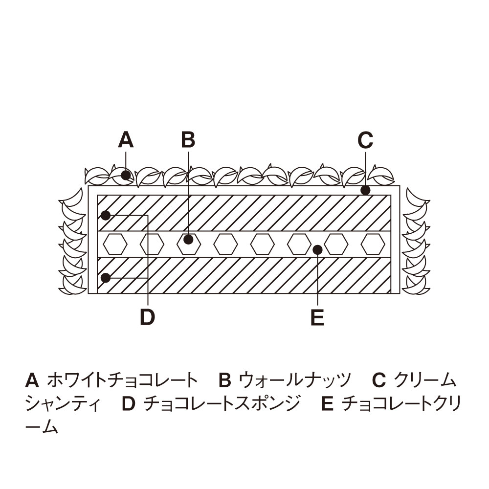 ホワイトチョコーレートで包み込んだやわらかいフォルムのチョコレートケーキです。ウォールナッツ(くるみ)入りのチョコレートクリームをふわふわのチョコレートスポンジでサンドしました。