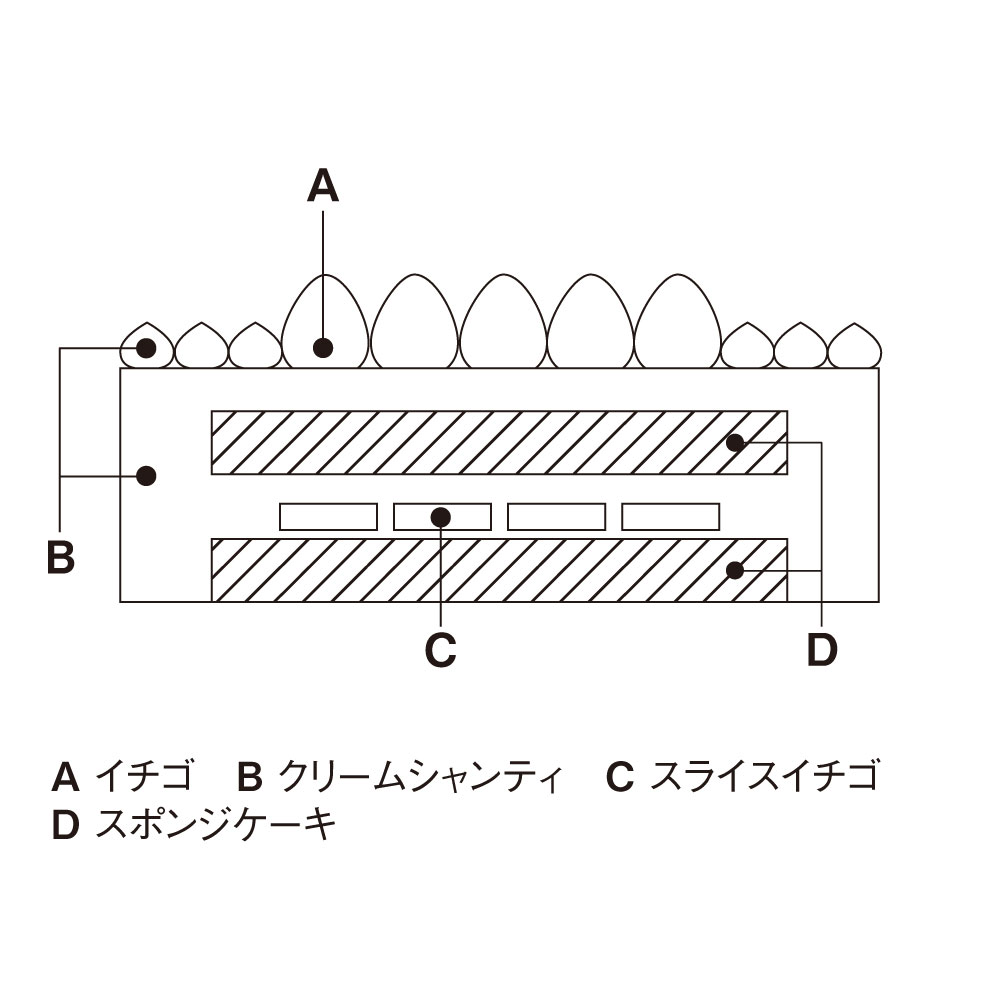 ふんわり口どけが良くたまごの味わいが豊かなスポンジケーキで、スライスしたいちごとたっぷりのクリームシャンティをサンド。天面にはいちごを5粒トッピングし、柊オーナメントと金色の「メリークリスマス」オーナメントが華やかにケーキを飾ります。