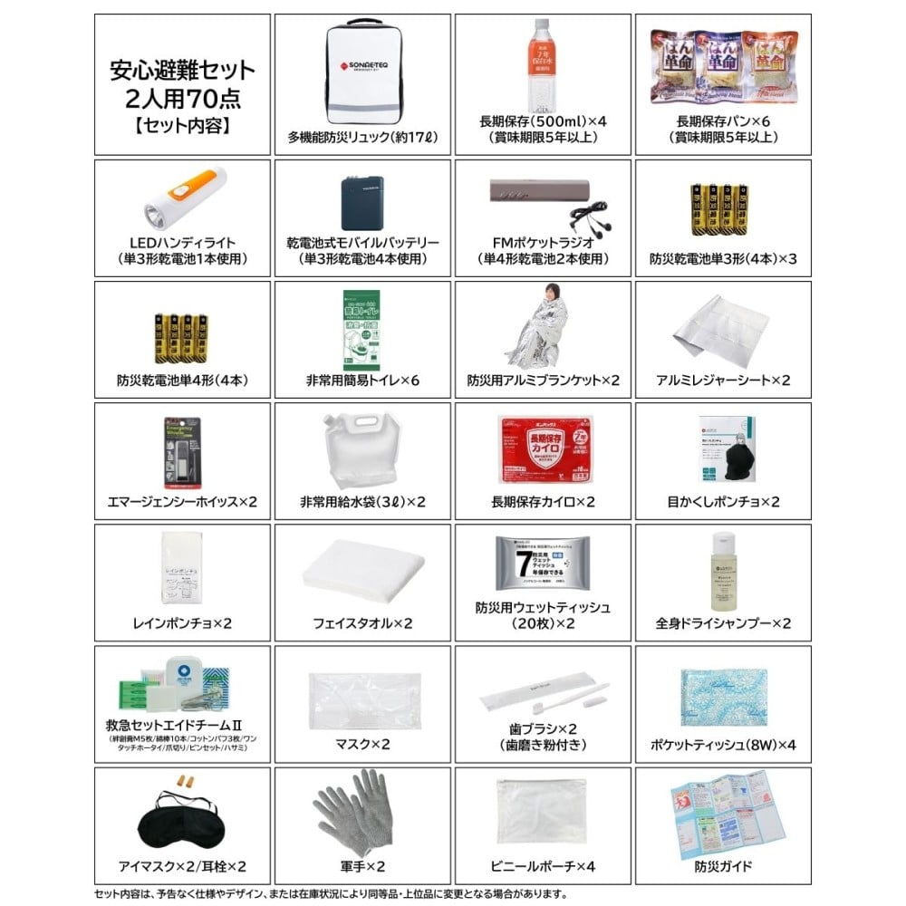 多機能防災リュック(17L)、長期保存水(500ml)×4、長期保存パン(100g)×6、LEDハンディライト、乾電池式モバイルバッテリー、FMポケットラジオ、防災乾電池単3形(4本)×3、防災乾電池単4形(4本)、非常用簡易トイレ×6、防災用アルミブランケット×2、アルミレジャーシート×2、エマージェンシーホイッスル×2、非常用給水袋(3L)×2、長期保存カイロ×2、目かくしポンチョ×2、レインポンチョ×2、フェイスタオル×2、防災用ウェットティッシュ(20枚)×2、全身ドライシャンプー×2、絆創膏(M5枚)、綿棒(10本)、コットンパフ(3枚)、ワンタッチホータイ、爪切り、ピンセット、ハサミ、マスク×2、歯ブラシ(歯磨き粉付き)×2、ポケットティッシュ(8W)×4、アイマスク×2、耳栓×2、軍手×2、ビニールポーチ×4、防災ガイド