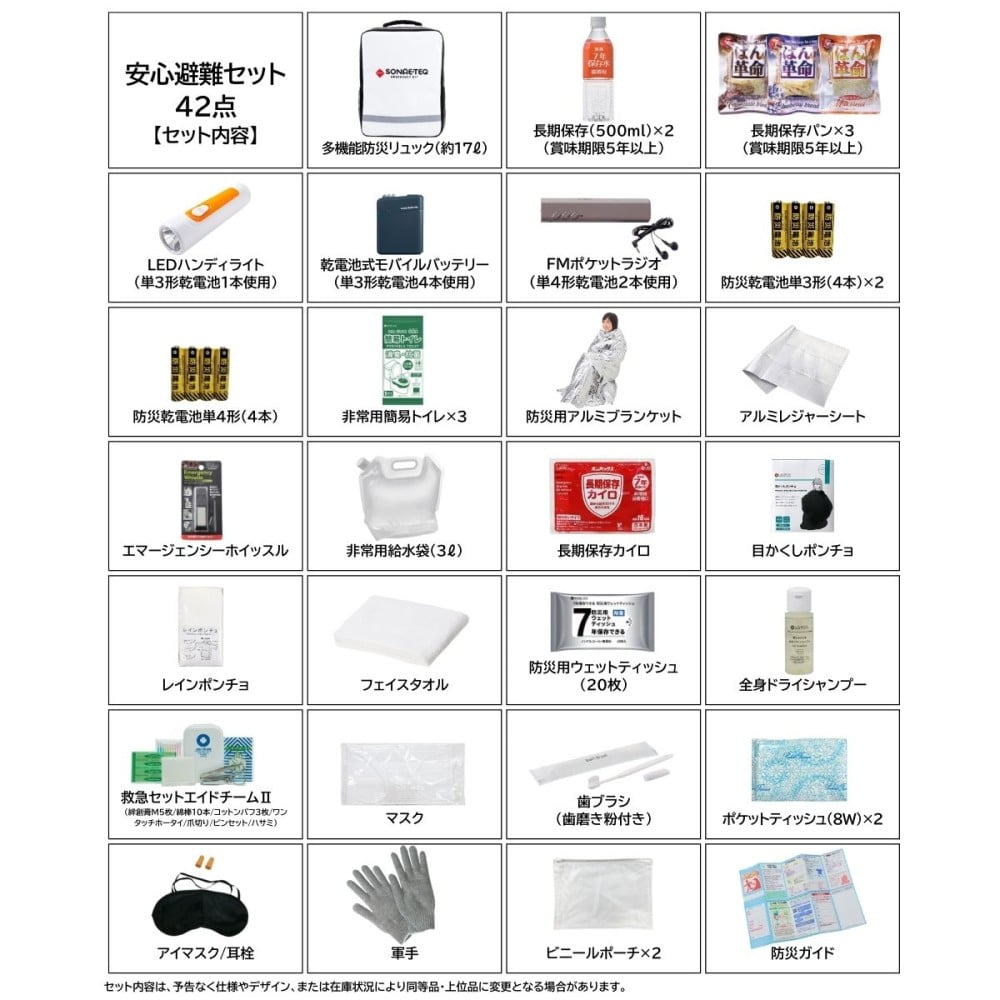 多機能防災リュック(17L)、長期保存水(500ml)×2、長期保存パン(100g)×3、LEDハンディライト、乾電池式モバイルバッテリー、FMポケットラジオ、防災乾電池単3形(4本)×2、防災乾電池単4形(4本)、非常用簡易トイレ×3、防災用アルミブランケット、アルミレジャーシート、エマージェンシーホイッスル、非常用給水袋(3L)、長期保存カイロ、目かくしポンチョ、レインポンチョ、フェイスタオル、防災用ウェットティッシュ(20枚)、全身ドライシャンプー、絆創膏(M5枚)、綿棒(10本)、コットンパフ(3枚)、ワンタッチホータイ、爪切り、ピンセット、ハサミ、マスク、歯ブラシ(歯磨き粉付き)、ポケットティッシュ(8W)×2、アイマスク、耳栓、軍手、ビニールポーチ×2、防災ガイド