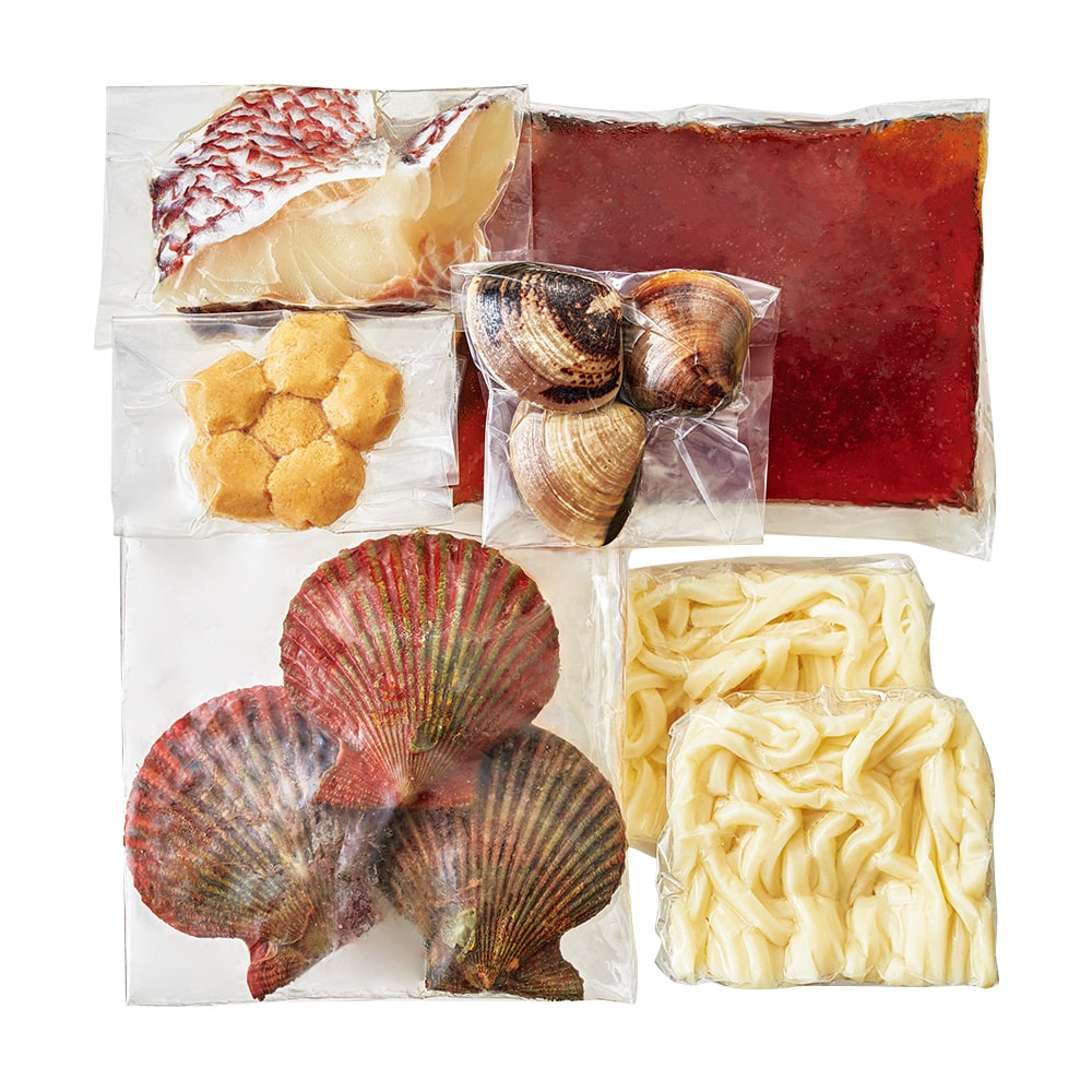 三重県産はまぐり3個、伊勢まだい3切、ヒオウギ貝3個、伊勢どりつくね6個、うどん2玉、鍋つゆ500ml、3人前