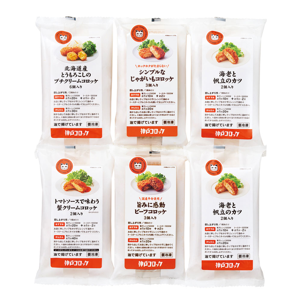 海老と帆立のカツ 2個入×2、トマトソースで味わう 蟹クリームコロッケ 2個入、旨みに感動ビーフコロッケ 3個入、北海道産とうもろこしのプチクリームコロッケ 6個入、シンプルなじゃがいもコロッケ 3個入
