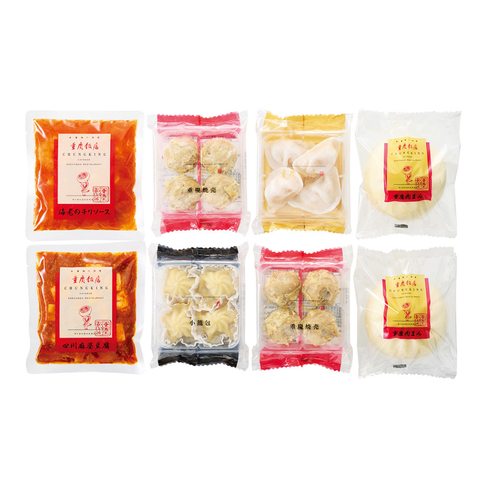 重慶肉まん120g×2、海老のチリソース180g、四川麻婆豆腐180g、重慶焼売4個入(35g×4)×2、小籠包4個入(30g×4)、蝦仁餃子4個入(25g×4)