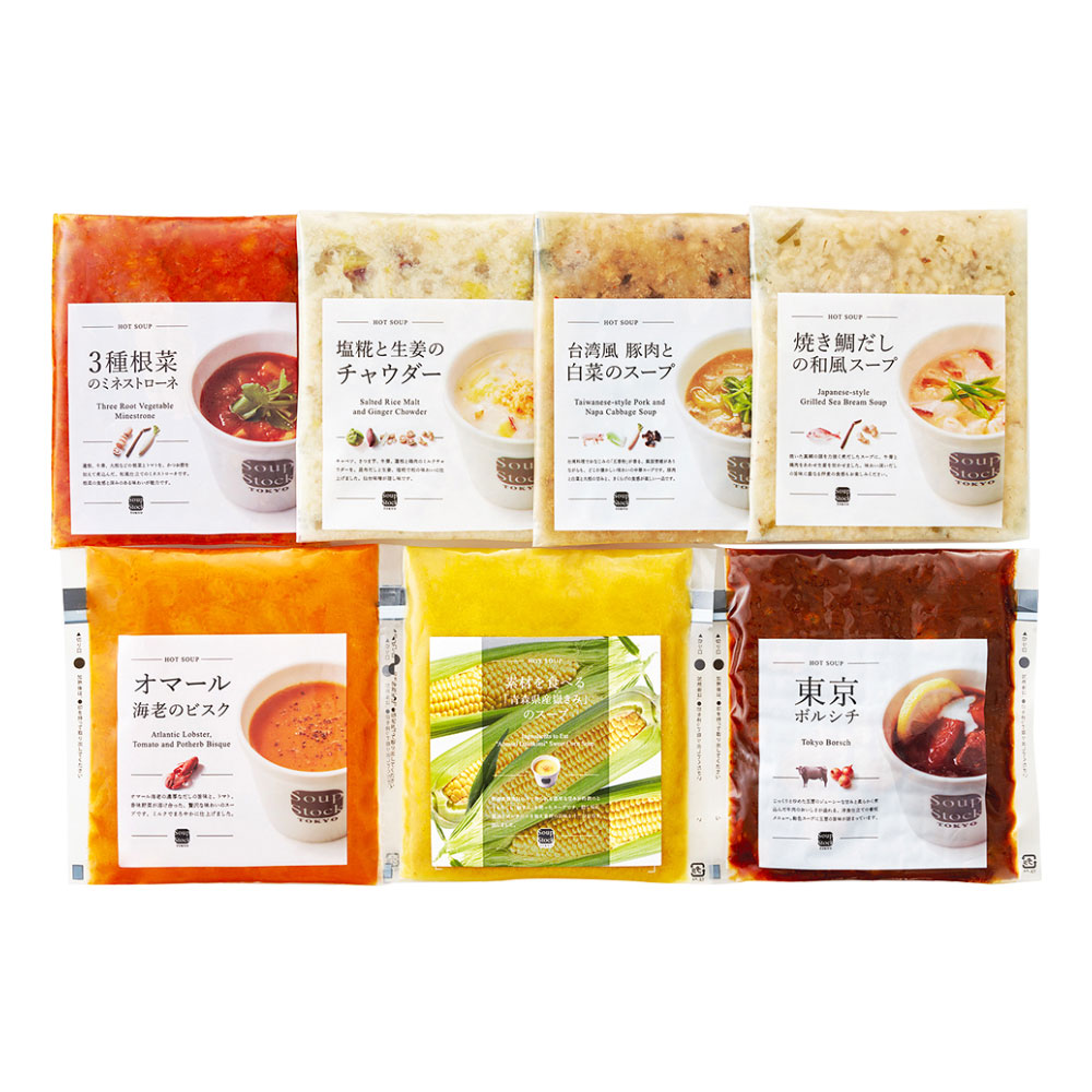 オマール海老のビスク・東京ボルシチ・素材を食べる青森県産嶽きみのスープ・塩糀と生姜のチャウダー・3種根菜のミネストローネ・焼き鯛だしの和風スープ・台湾風豚肉と白菜のスープ各180g