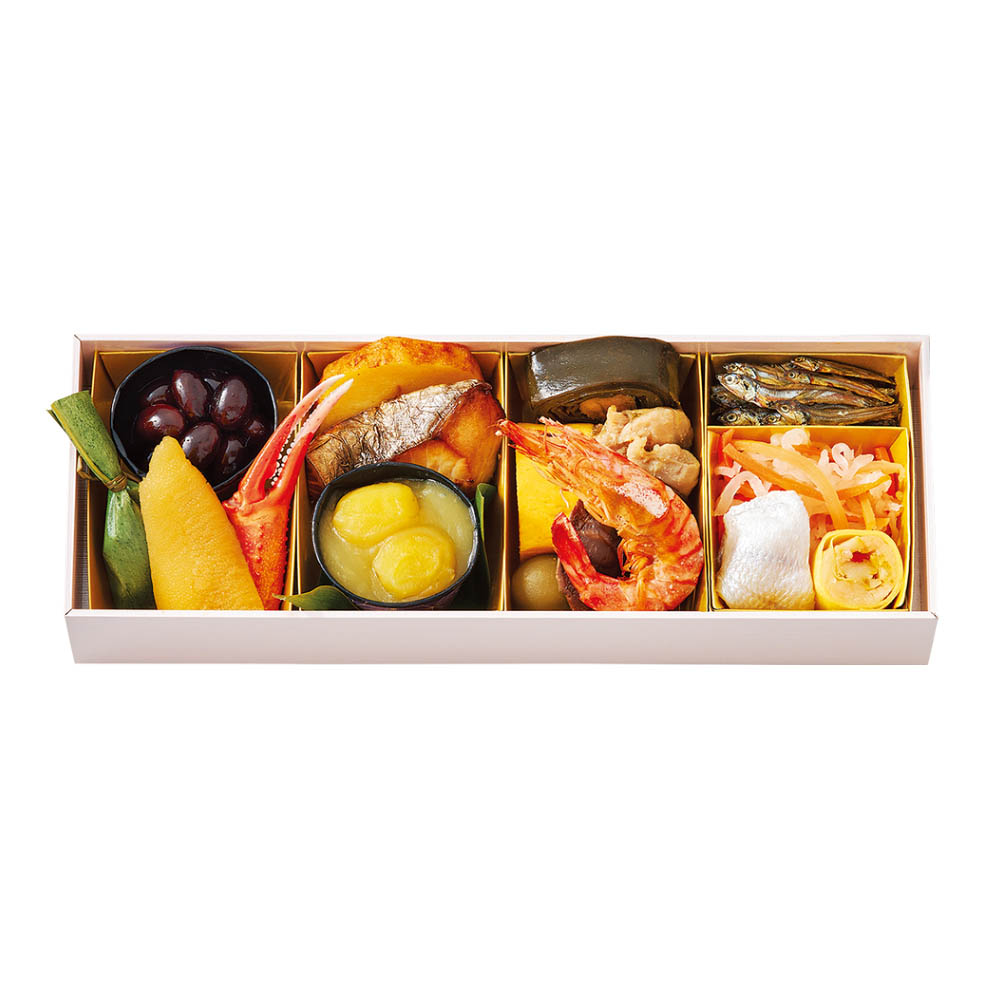 丹波黒豆煮、抹茶笹巾着、味付数の子、紅ずわい蟹柚庵焼、伊達巻、鰆柚庵焼、どんこ椎茸煮、栗きんとん、さんま昆布巻き、ほか8種