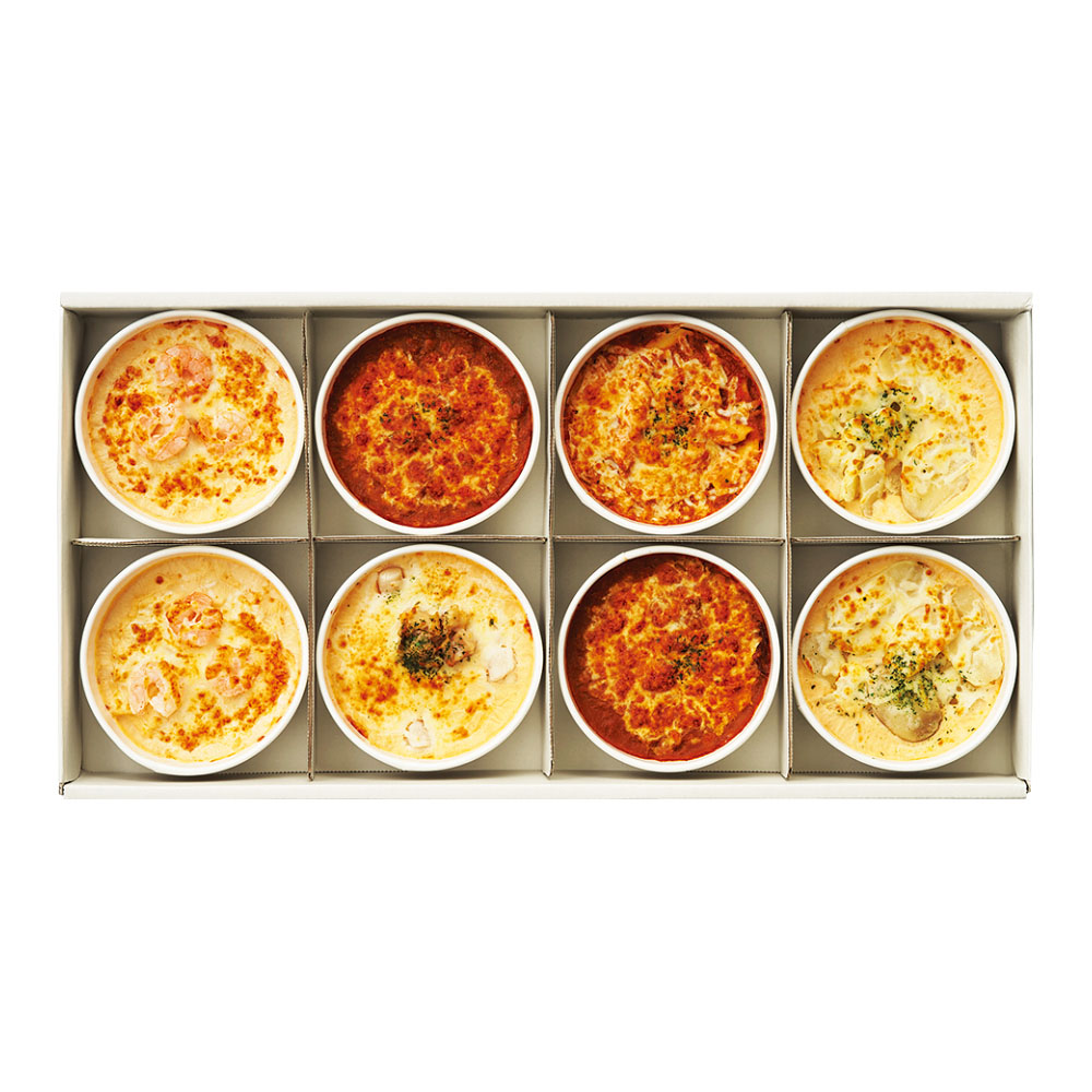 ビーフドリア・ポテトグラタン各135g×2、シュリンプマカロニグラタン120g×2、チキンドリア・ペンネミートソース(グラタン)各135g