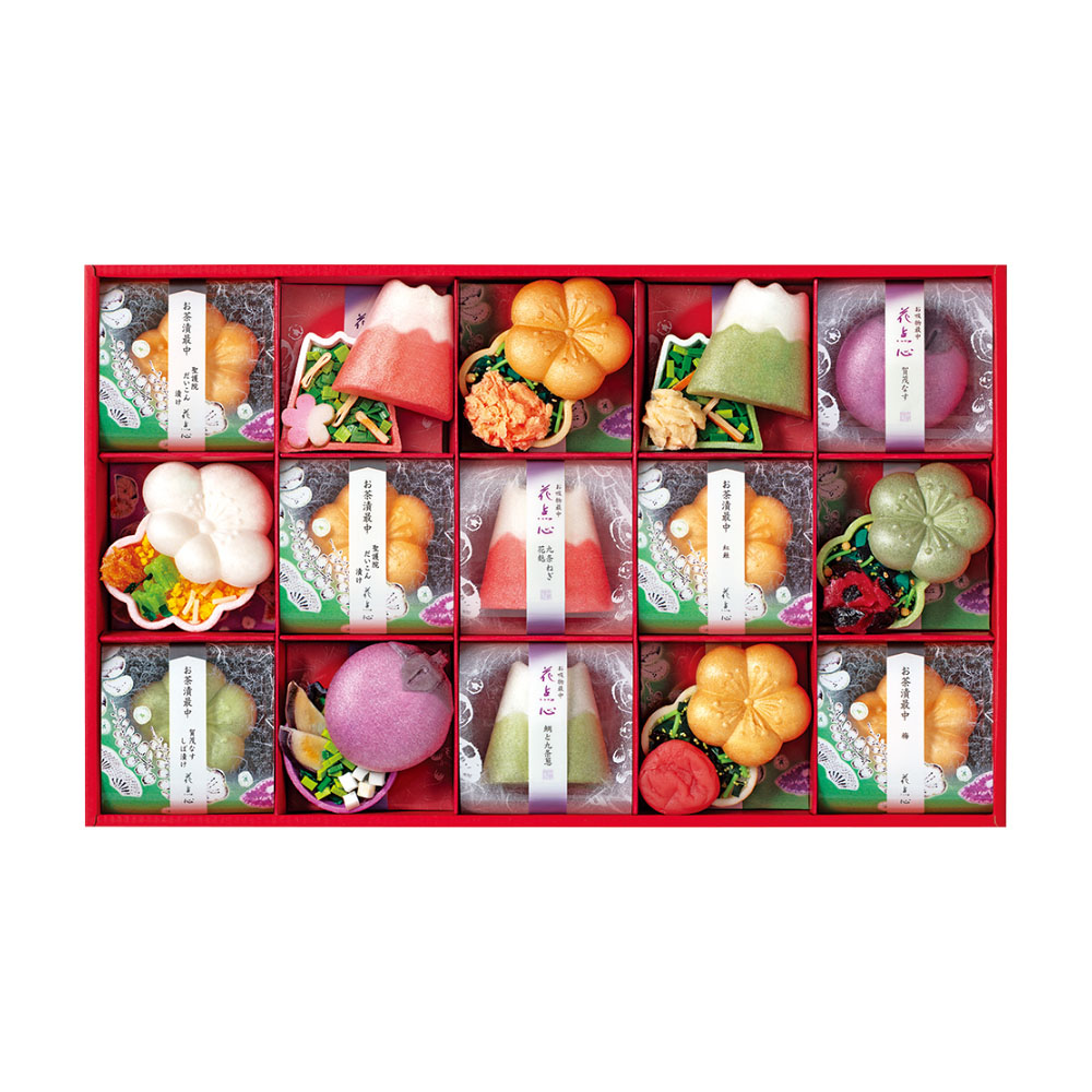 お茶漬:賀茂なすしば漬け・梅・紅鮭・聖護院だいこん漬け各2、お吸物:九条ねぎ(鯛・花麩)・賀茂なす各2、京壬生菜(ふかひれ)