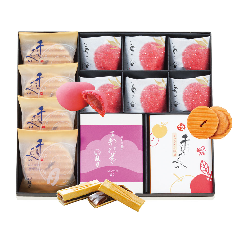 プレミアム千寿せんべい×4、万都の葉(2個入)、姫千寿せんべいキャラメル林檎(4個入)、苺の香×6