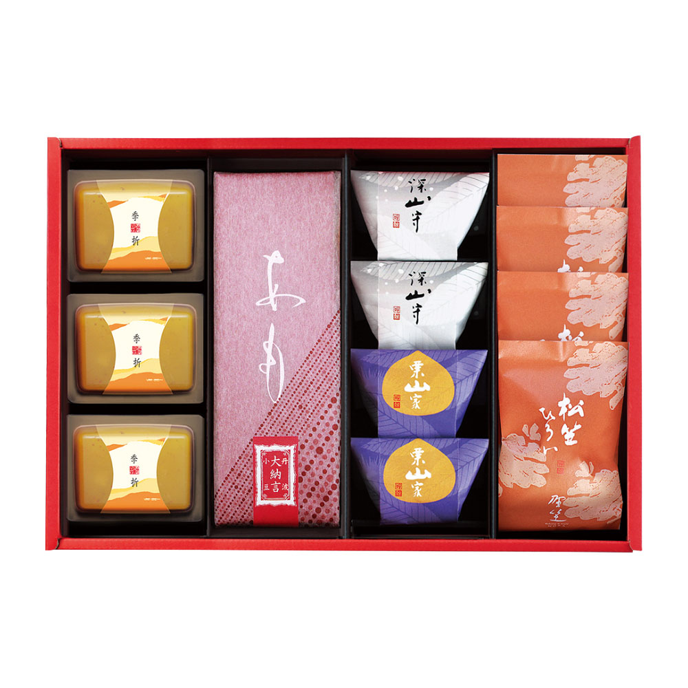 代表銘菓「あも」と、米粉で焼きあげた新商品「松笠ひろい」を中心に、栗や芋を楽しめる人気の季節銘菓も一緒に詰め合わせました。幅広い世代の方に喜んでいただけるギフトです。