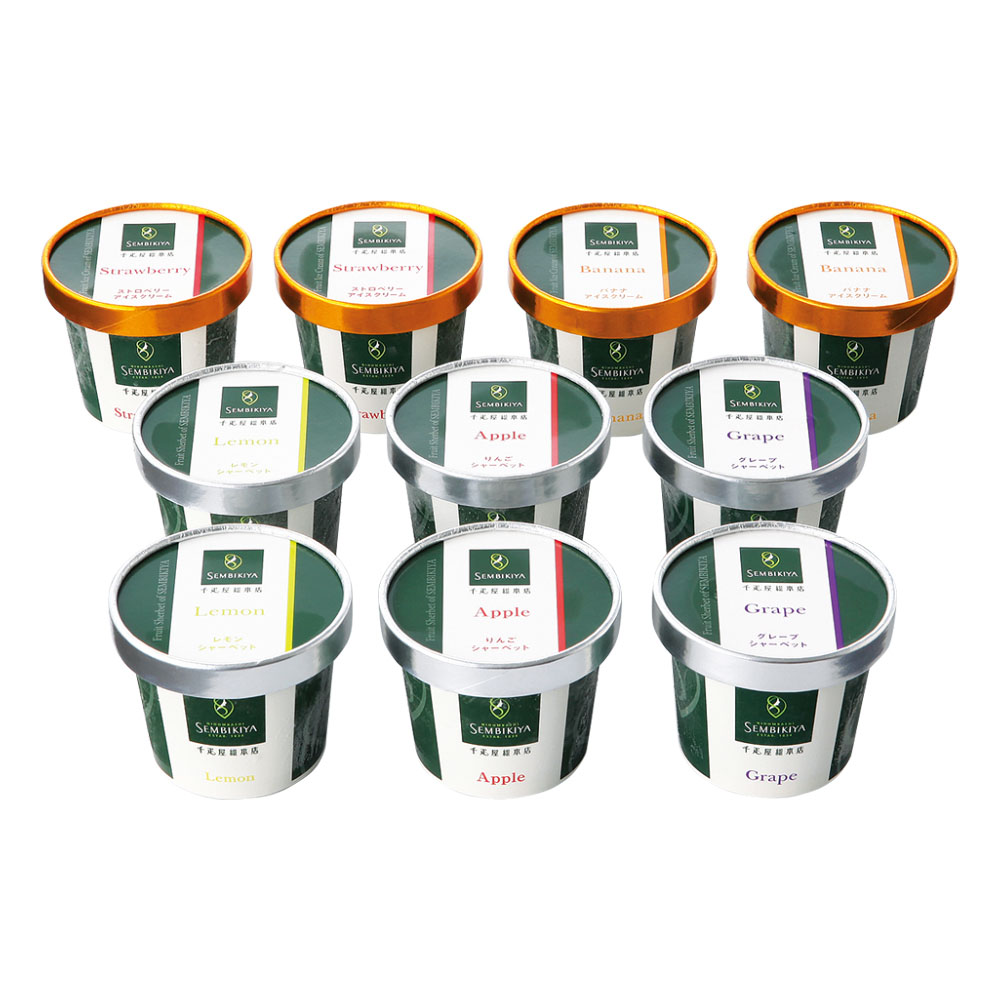 アイスクリーム(バナナ・ストロベリー)各120ml×2、シャーベット(グレープ・りんご・レモン)各120ml×2