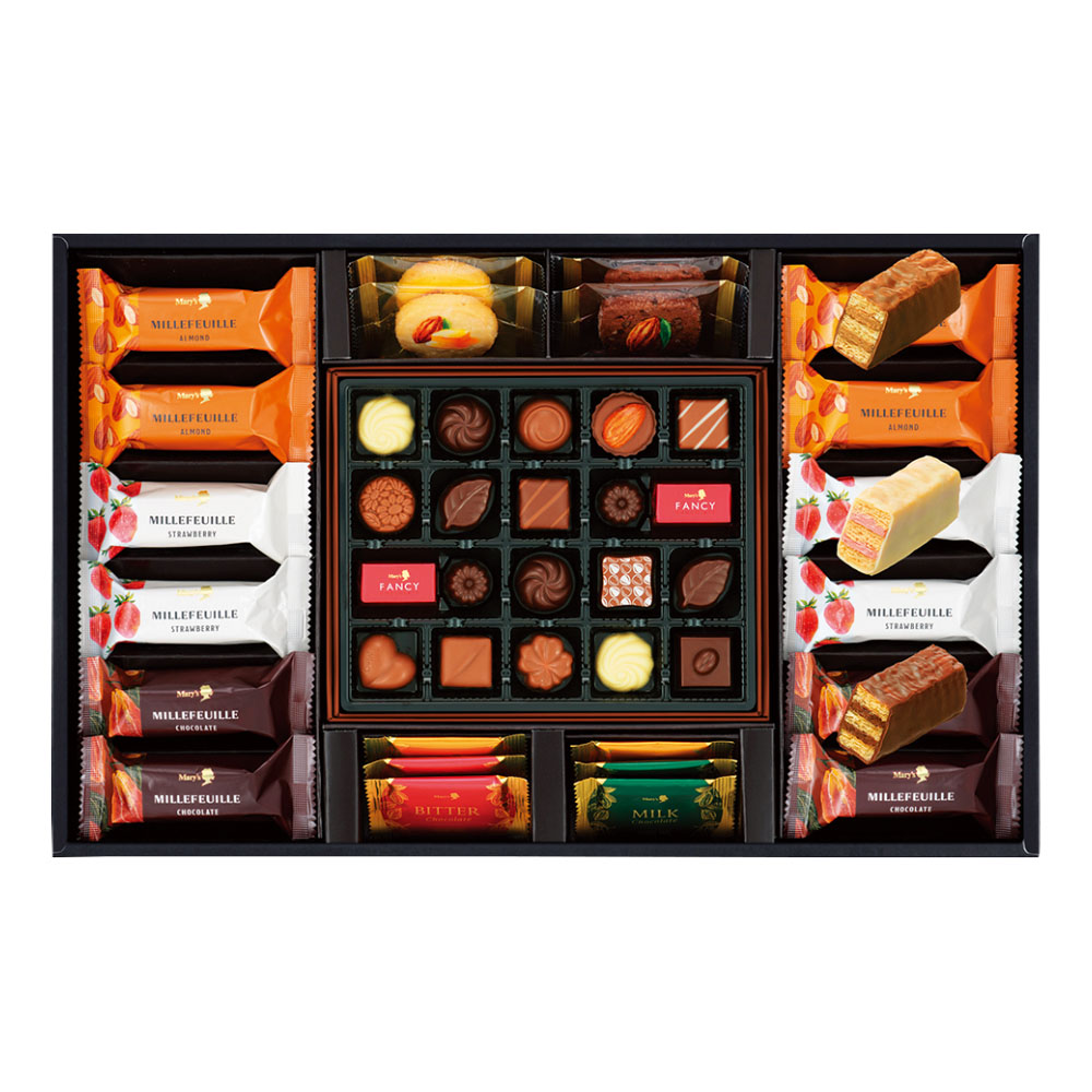 ファンシーチョコレート×20、ミルフィーユ×12(アーモンド・ストロベリー・チョコレート各4)、プレーンチョコレート3種計6、カカオサブレ2種計4
