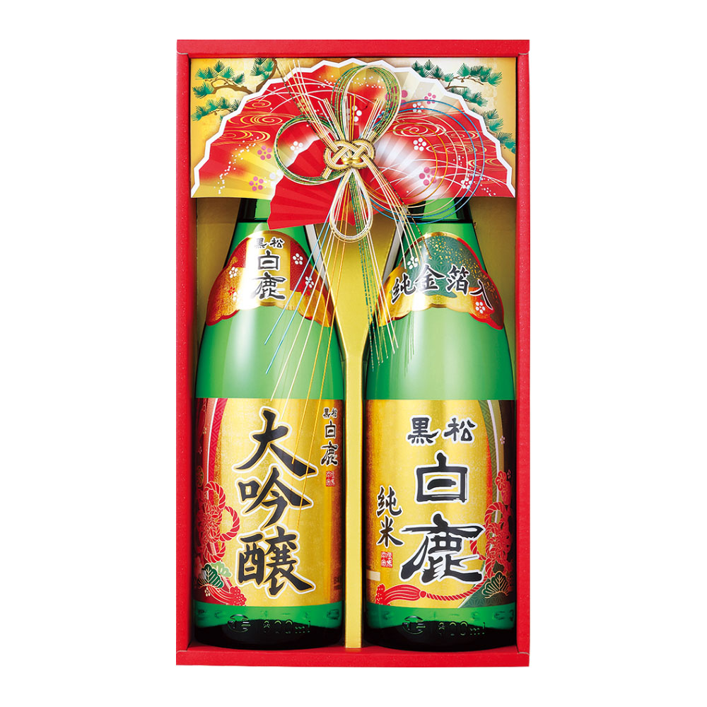 豊かなコクと軽快な味わいの純米酒(純金箔入)を、大吟醸酒とセットに。迎春を彩る華やかな贈りものです。