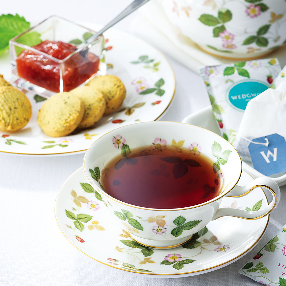 ワイルドストロベリー柄が可愛らしいセット。紅茶4種、ジャム、アップルやレモンが香るクッキー2種を。