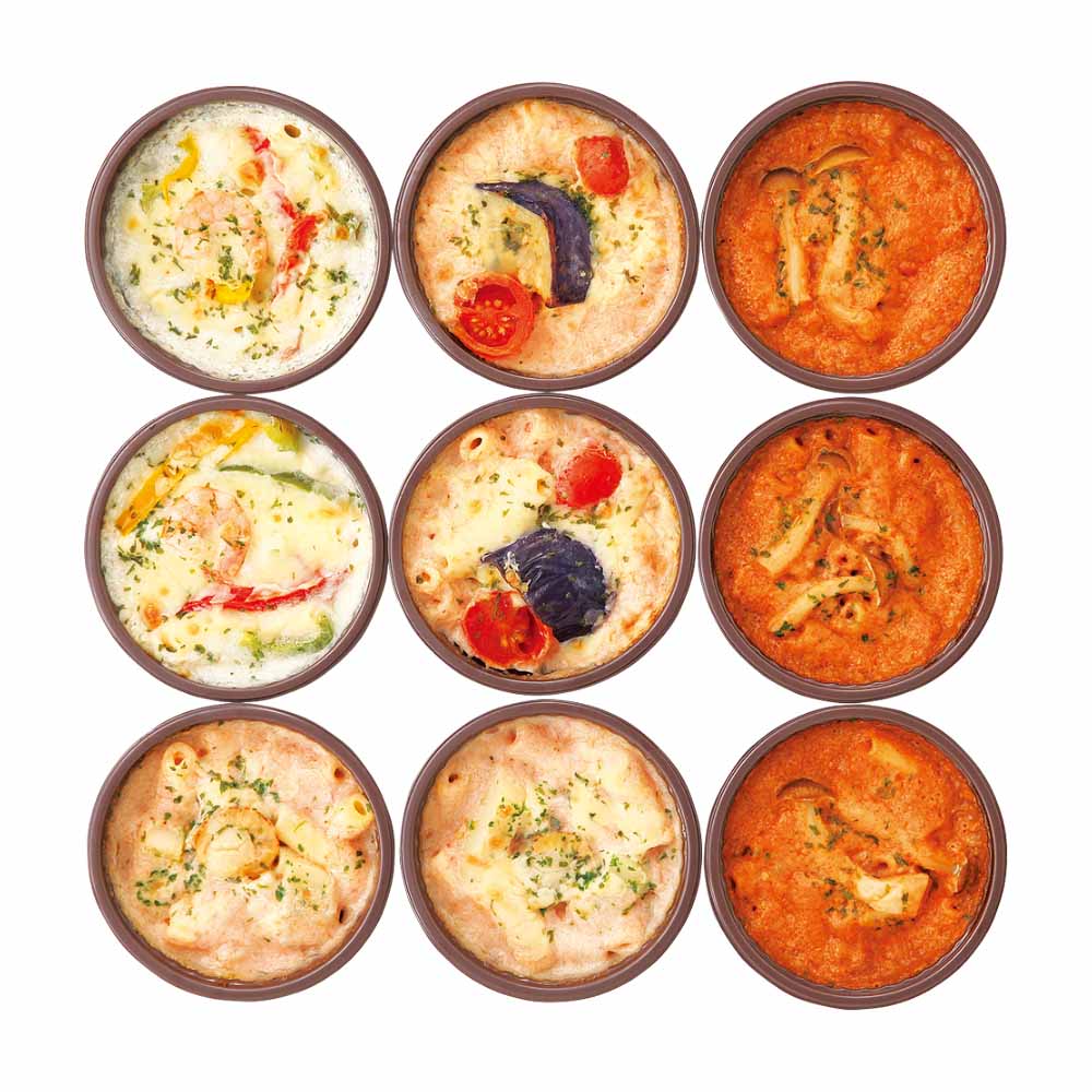 デミグラスソースのグラタン120g×3、ホタテとイカのシーフードグラタン・エビグラタン・茄子とトマトのグラタン各120g×2