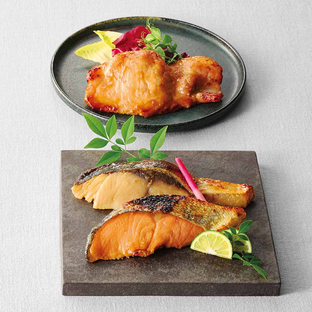 西京味噌を独自調味し、素材を漬け込んだ西京漬。別添レンジシート使用でレンジ調理も可能。魚だけでなく、豚肉、鶏肉も入った、人気の魚と肉のセット。柚子の香りを忍ばせ、素材の旨みを引きだしました。