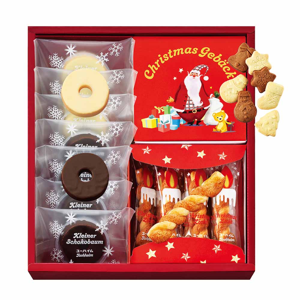 サンタをあしらったパッケージ入りのビスケットや、チョコレートコーティングの2種のバウムなどを、バラエティー豊かに。