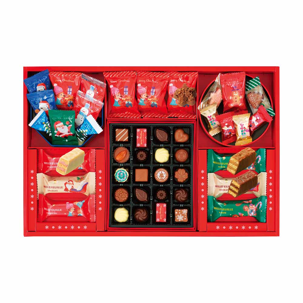 クリスマスデザインの可愛らしい缶やチョコレートとミルフィーユで、クリスマスムードを盛りあげます。