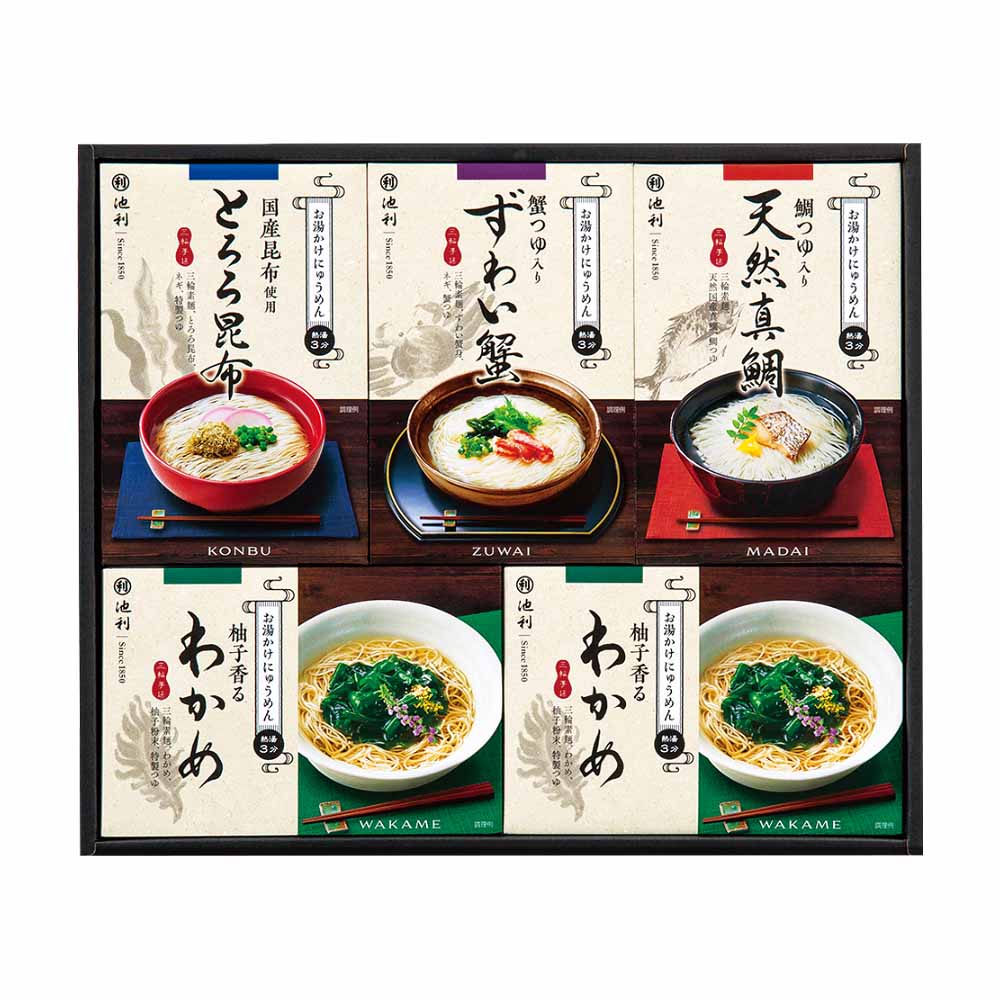 にゅうめん(蟹つゆ入りずわい蟹・鯛つゆ入り天然真鯛・とろろ昆布、柚子香るわかめ×2):麺各45g、つゆ・具材付