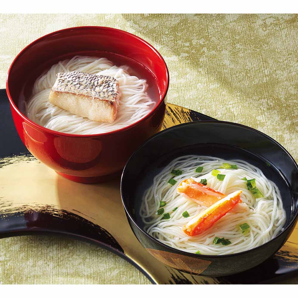 にゅうめん(蟹つゆ入りずわい蟹・鯛つゆ入り天然真鯛・とろろ昆布・柚子香るわかめ各2):麺各45g、つゆ・具材付