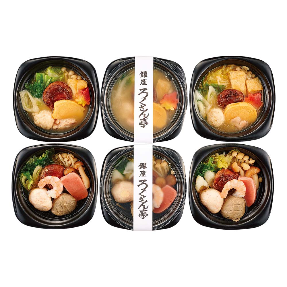 道場六三郎氏が手がける銀座ろくさん亭より、白味噌仕立ての鶏小鍋と、醤油味の海鮮小鍋のセット。電子レンジで温めるだけで、名店の味わいをご堪能いただけます。