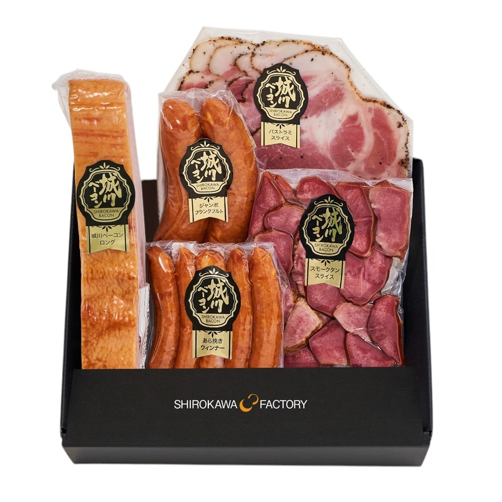 城川ベーコンロング310g、あら挽きウインナー100g、スモークタンスライス90g、パストラミスライス125g、ジャンボフランクフルト140g