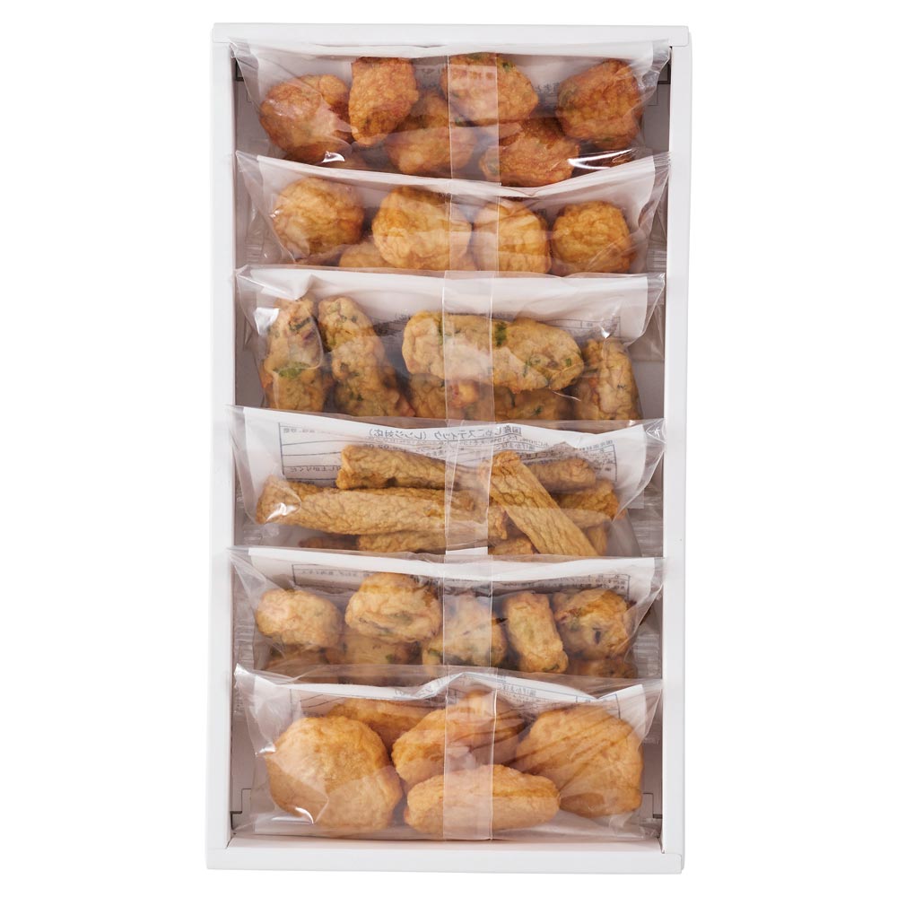 海老・帆立・タコ・豆腐・野菜などを具材に使用してひとくち揚げ・丸天・スティックに仕上げたバラエティー豊かな揚げかまぼこの詰め合わせです。