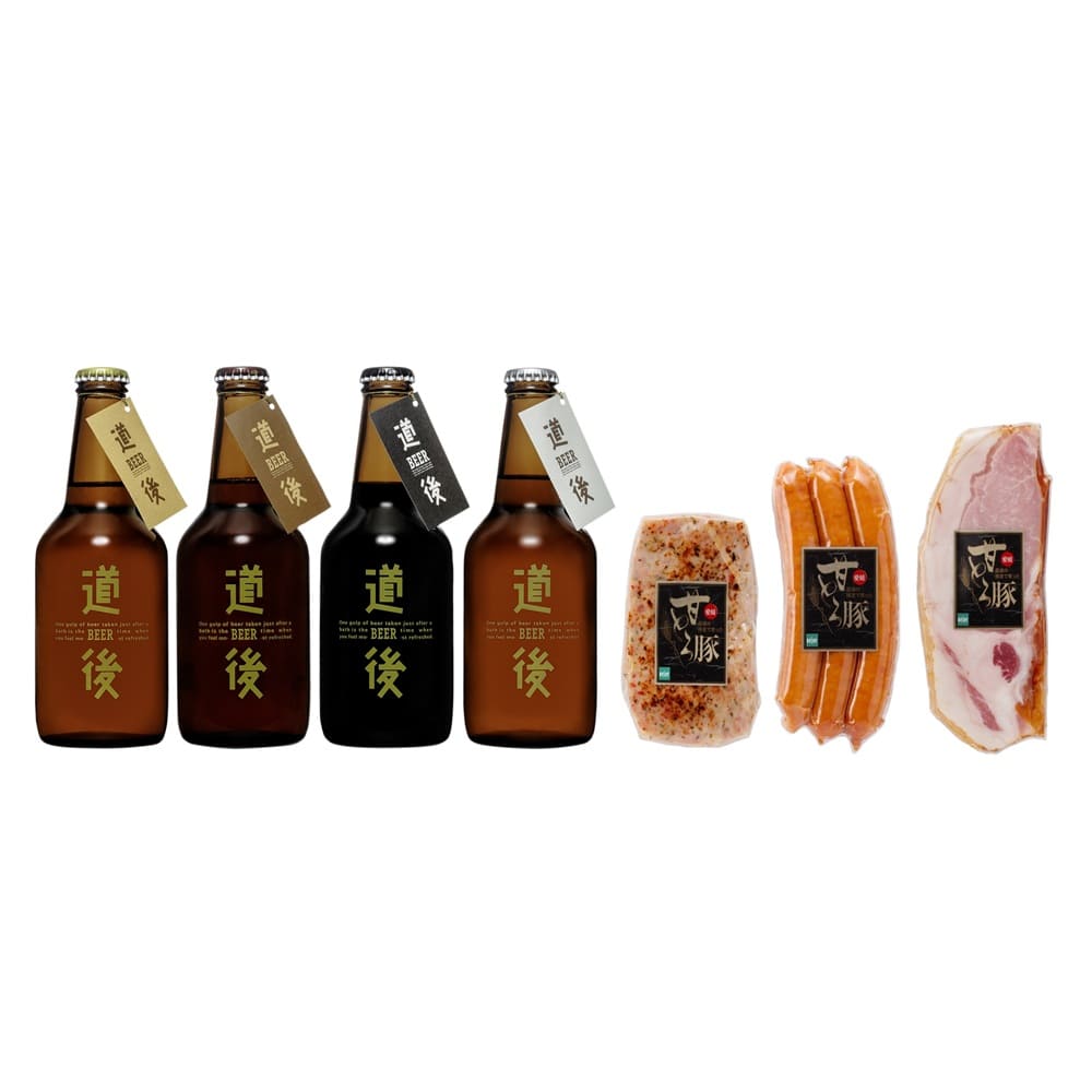 愛媛県・水口酒造:道後ビール(ケルシュ・アルト・スタウト・ヴァイツェン)各330ml、愛媛甘とろ豚ウインナー(3本)80g、愛媛甘とろ豚ミートローフ・愛媛甘とろ豚ソミュールロースハム 各120g