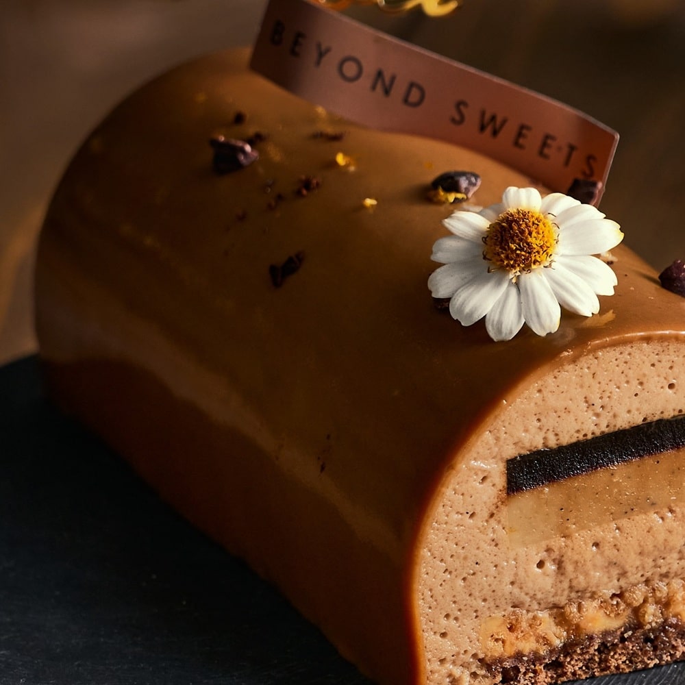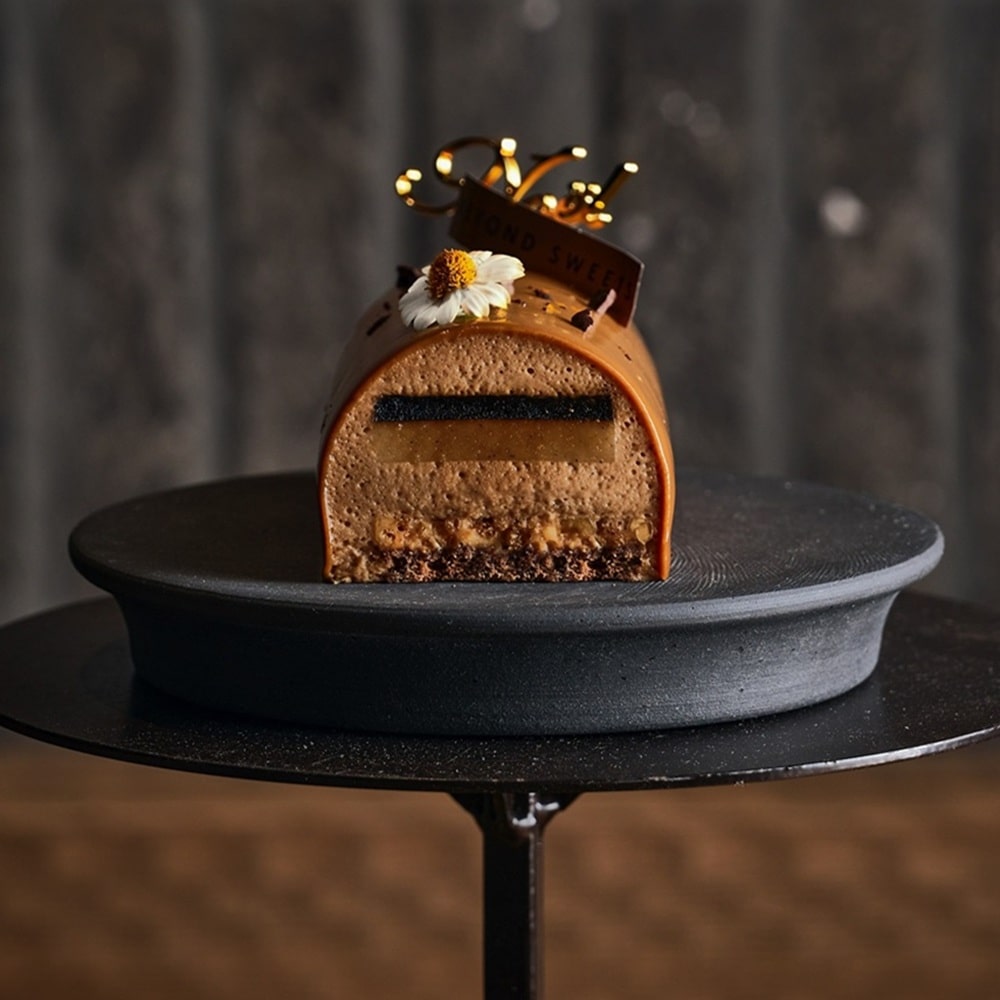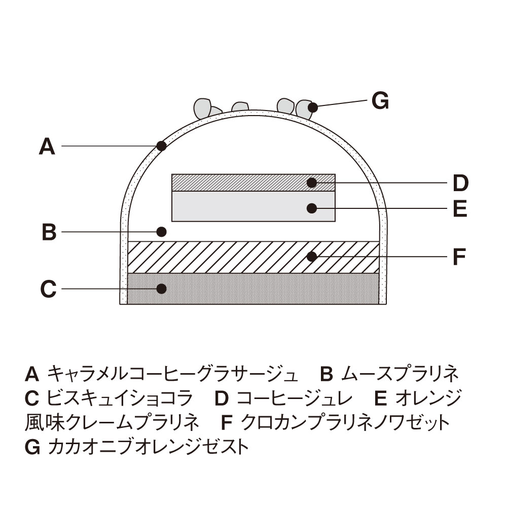 濃厚なヘーゼルナッツの香ばしいムースとコーヒージュレ、プラリネクリームを重ねた、ナッツ好きにはたまらないムース。砂糖を使用せず、オリゴ糖や羅漢果糖で甘みを付けた低糖質かつグルテンフリーのクリスマスケーキ。