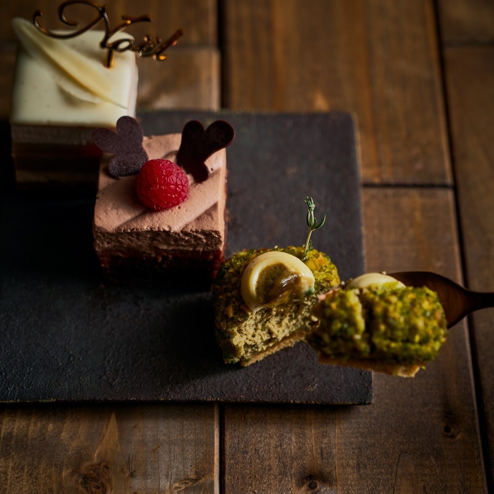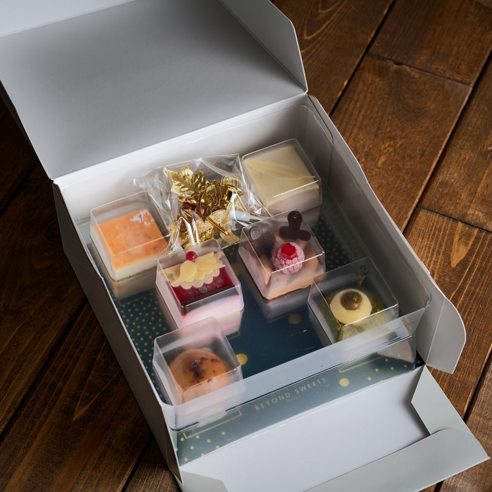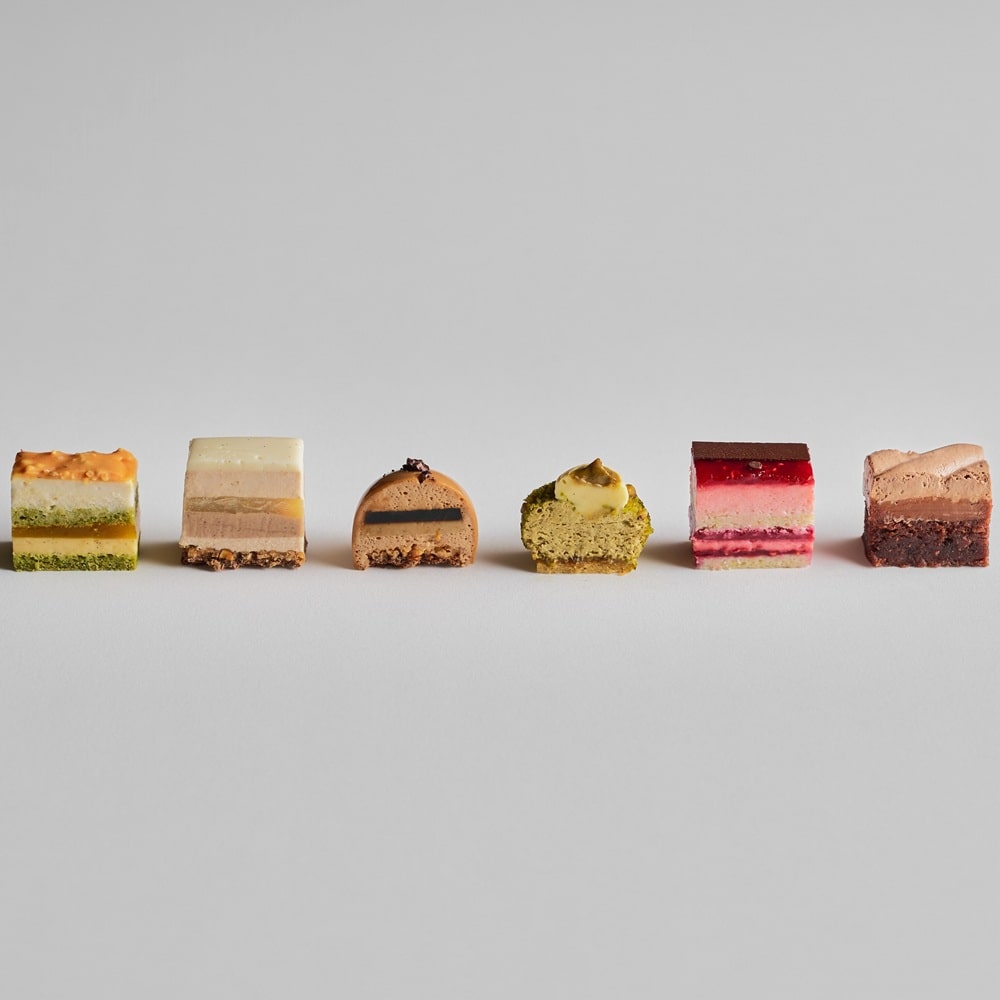 小麦、白砂糖、香料や着色料不使用で作る、低糖質、動物性食品不使用などのカラダを想うケーキの詰め合わせ。小さなプチフールなので、食事 の後でもお楽しみいただけます。