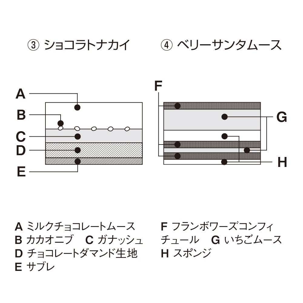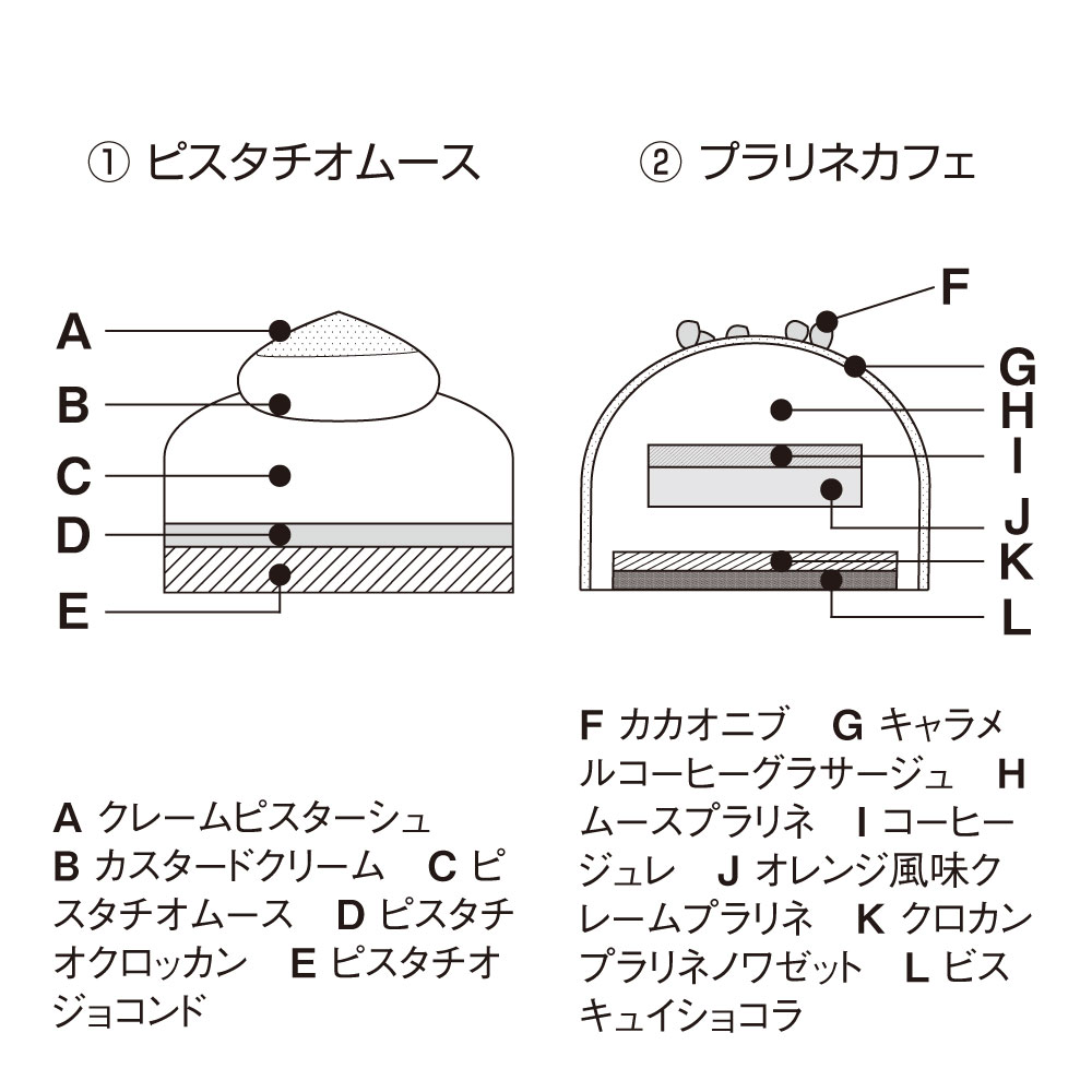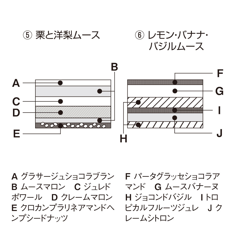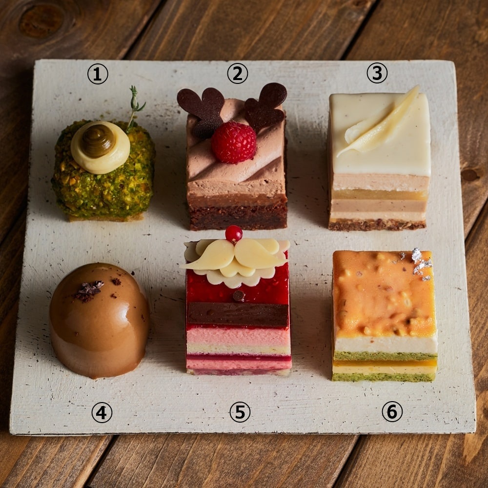6個(ピスタチオムース、プラリネカフェ、ベリーサンタムース、ショコラトナカイ、栗と洋梨ムース、レモン・バナナ・バジルムース)