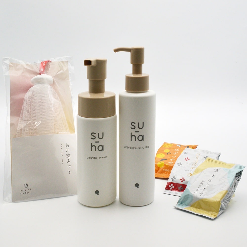 コットントートバッグ (よーじや ハッピーバッグ2026限定)、缶バッジ(よーじや ハッピーバッグ2026限定)、su-ha ディープクレンジングジェル(メイク落とし)、su-ha スムースアップホイップ(泡状洗顔料)、お風呂じかん はなほのか(入浴料)、お風呂じかん まゆごもり(入浴料)、お風呂じかん ゆずつやや(入浴料)、あわ珠ネット