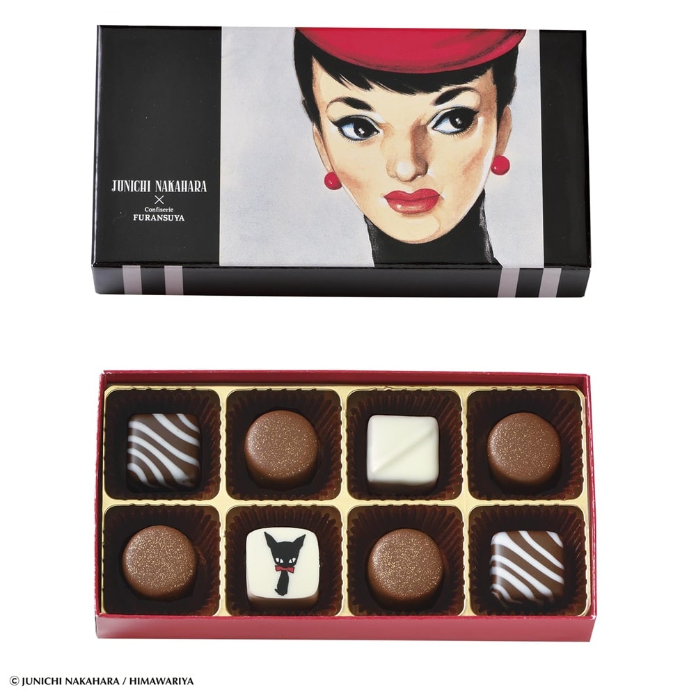 ブランデーの香り豊かなガナッシュとアーモンドの香ばしさを生かしたジャンドゥヤ、黒猫をプリントしたカフェオレとラムレーズンガナッシュの詰め合わせ。