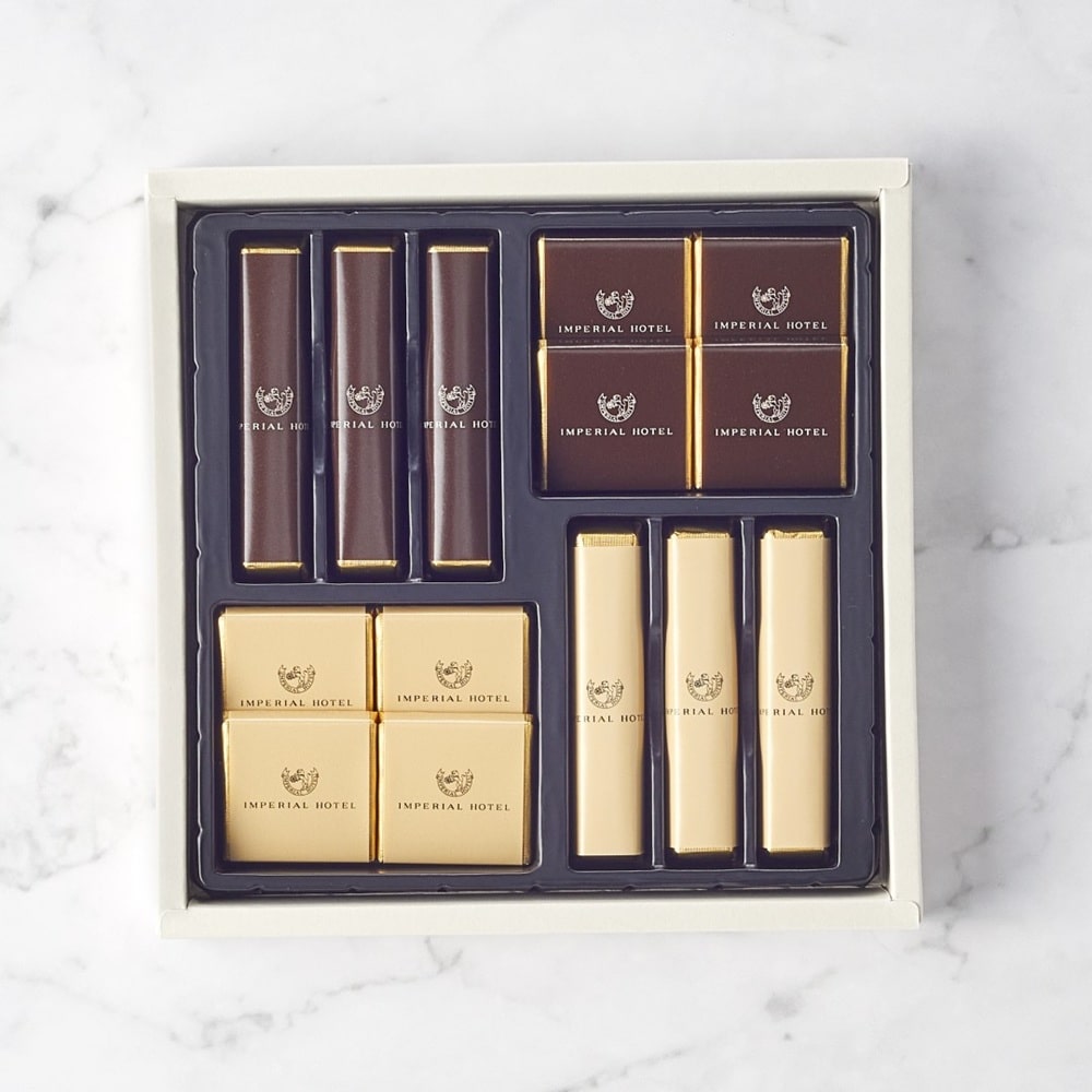 帝国ホテル2代目本館(通称「ライト館」)の外壁のスクラッチタイルを模したスティック型チョコレートと、プレート型チョコレートの4種類詰め合わせです。