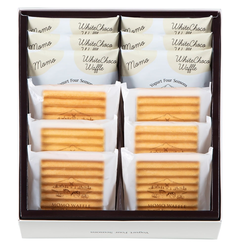 クッキー生地で特製ヨーグルトクリームをサンドした「モーモーワッフル」と、秋冬限定商品の「モーモーホワイトチョコワッフル」の詰め合わせです。
