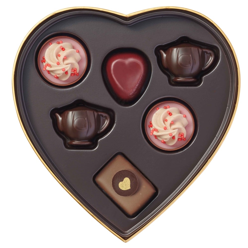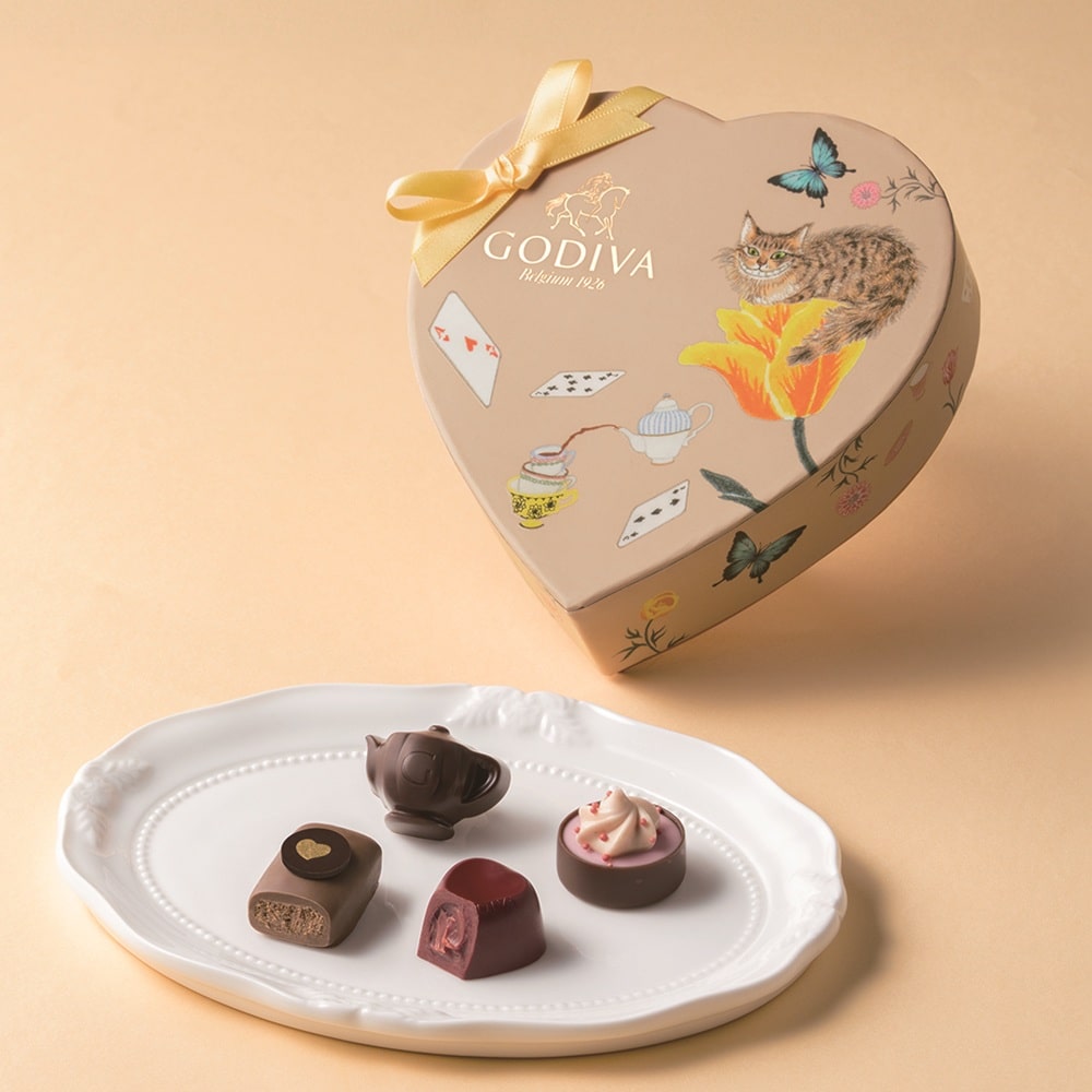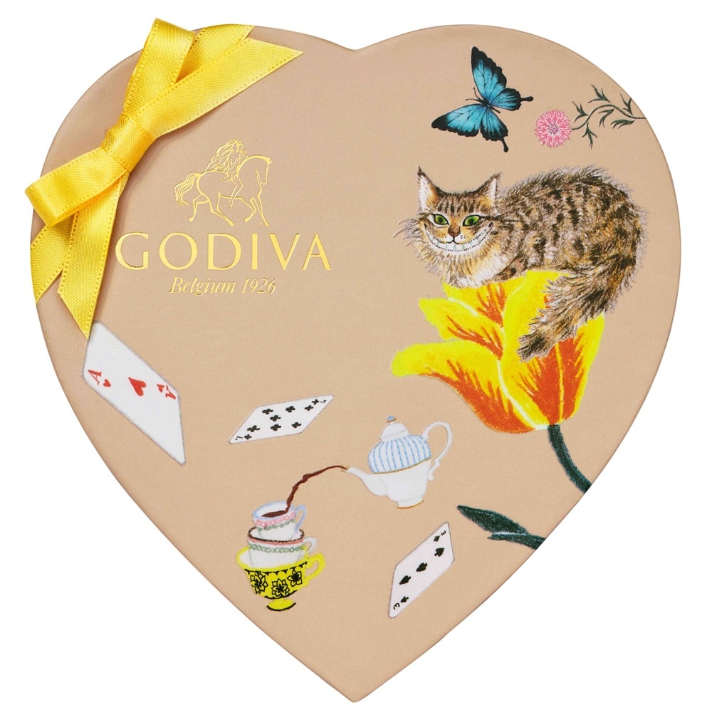 「不思議の国のアリス」の印象的なシーン「ティーパーティ」をイメージしたチョコレートを楽しめる、キュートな「アリスのティーパーティ コレクション」。 ティーパーティを彩る紅茶やカップケーキなどをイメージした限定チョコレートを、物語のシンボルのトランプやティーセット、いたずら好きなチェシャ猫を描いたハート形のパッケージに詰め合わせました。