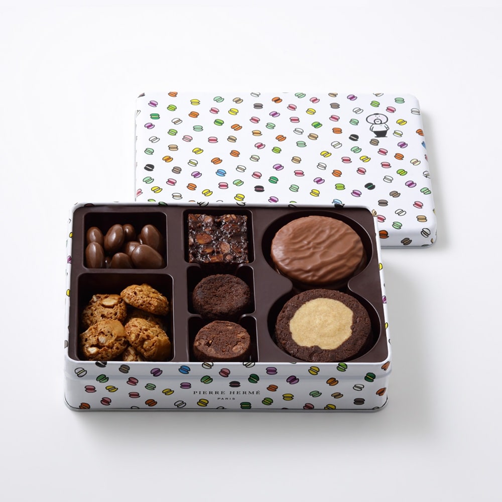 印象深いミルクチョコレートと甘酸っぱいパッションフルーツの「サブレ モガドール」や香り高いヘーゼルナッツの「クロック ノワゼット」など6種のサブレと、「アマンド オ レ」を詰め合わせました。贈りものにもおすすめです。