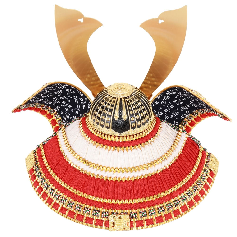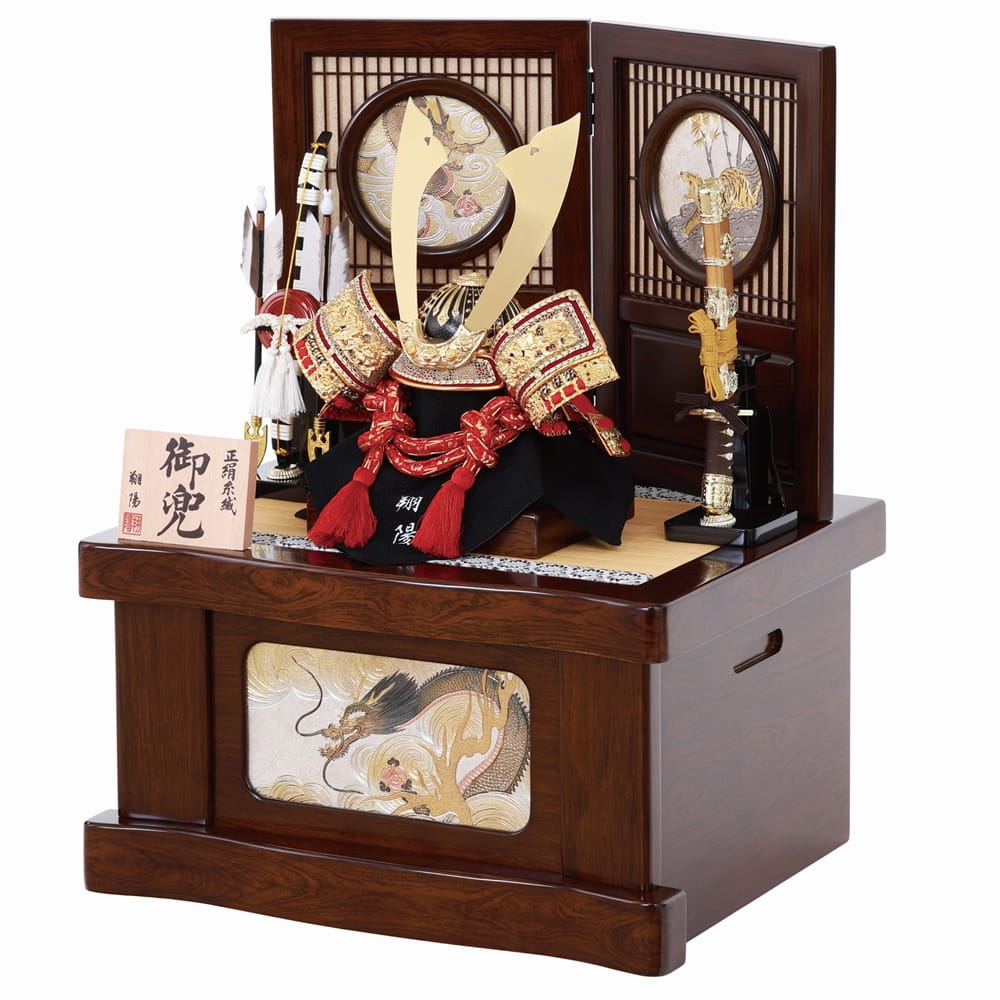 飾台が収納箱になっているタイプの兜飾りで、準備や片付けがしやすい点が特徴です。屏風には、天の王者の龍と地の覇者の虎が争う様子を彫金で表しました。大振りの兜に相応しい力強いひと品です。