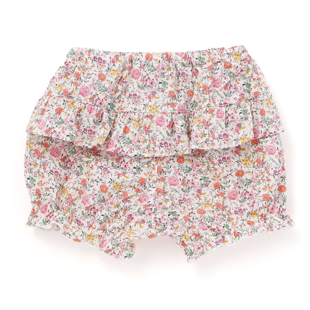 柔らかな天竺素材のチュニック半袖Tシャツと、リバティプリント柄のフリルブルマの女の子用3点セット。