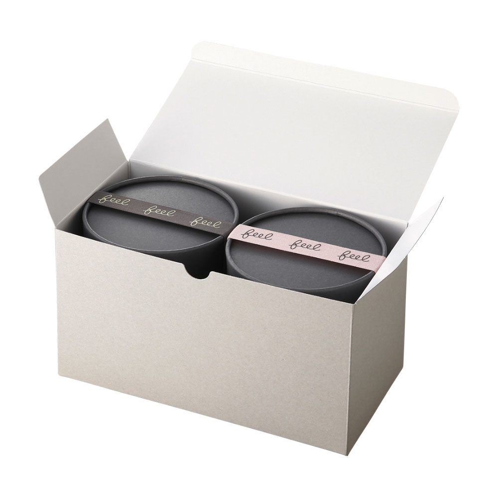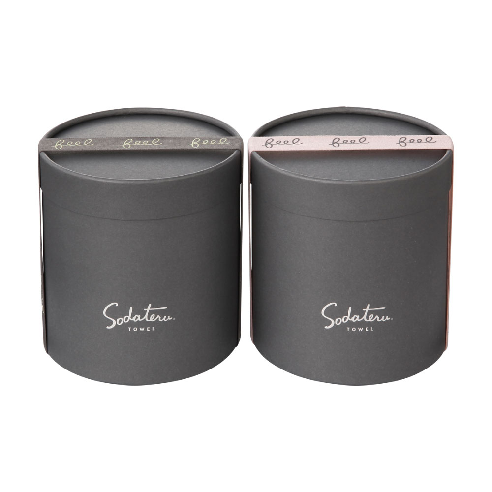 〈育てるタオル〉のfeelシリーズは、ヘムまでパイルの心地よさ。落ち着いたカラーのタオルも筒形ボックスも、贈りたくなるモダンなデザインです。