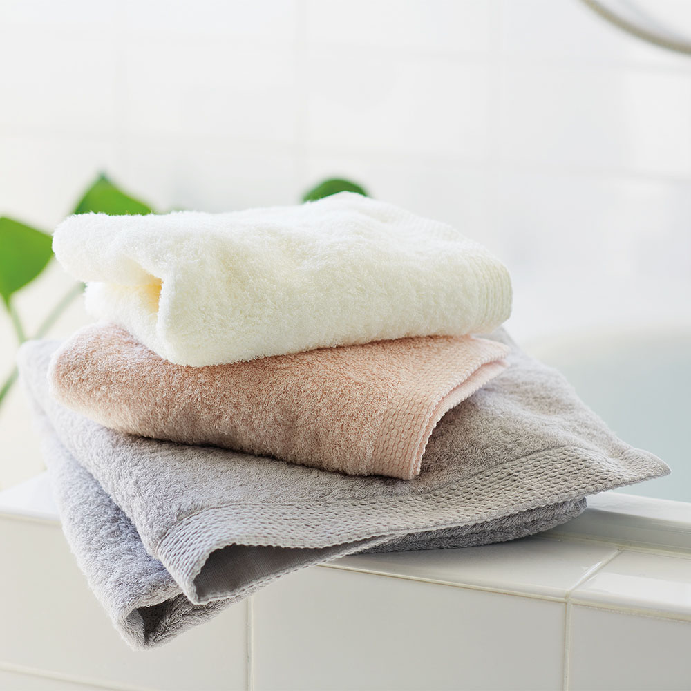 糸が空気をたっぷりと含んでおり、やさしく押さえるだけで水を吸い取ります。洗うたびにやわらかさを感じ、日常使いしやすい穏やかな色合いもうれしいタオルです。