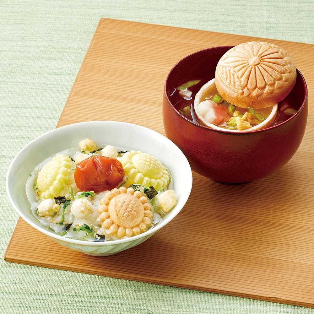 お吸物:ふぐときぬさや・3種きのことオクラ、味噌汁:里いもとオクラ、スープ:コーンポタージュ・アスパラ、お茶漬:紅鮭・梅干し