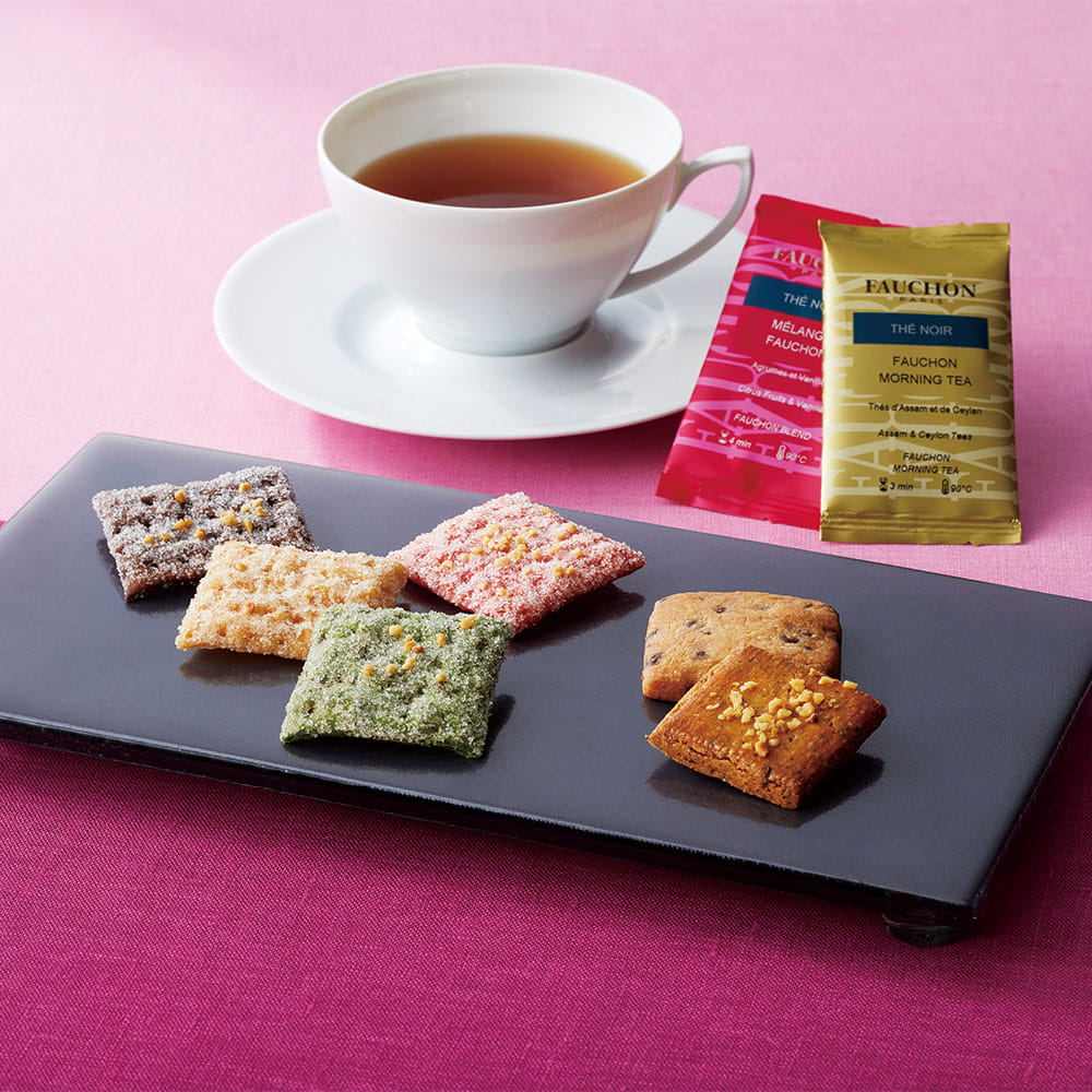 ティーバッグ(フォションモーニング・フォションブレンド)各4、サクリスタン(ナチュール・フランボワーズ・ピスターシュ・ショコラ)各2、クッキー×8