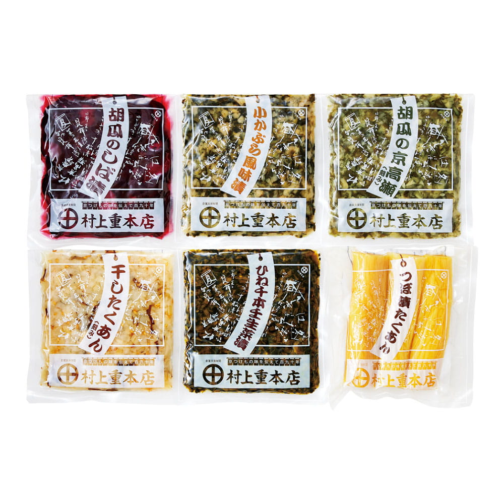 歯ごたえのよい胡瓜を漬けた人気の「胡瓜のしば漬」など、それぞれの野菜の持ち味をいかした漬物6種の詰め合わせです。